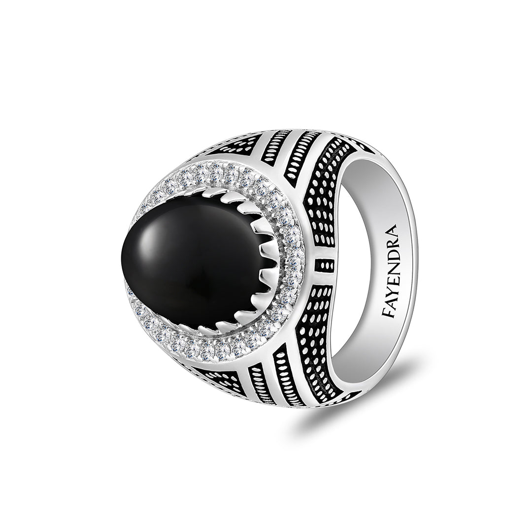 خاتم رجالي من الفضة الخالصة عيار 925 مطلي روديوم و اسود مرصع احجار عقيق اسود طبيعي كابشون و فص ابيض