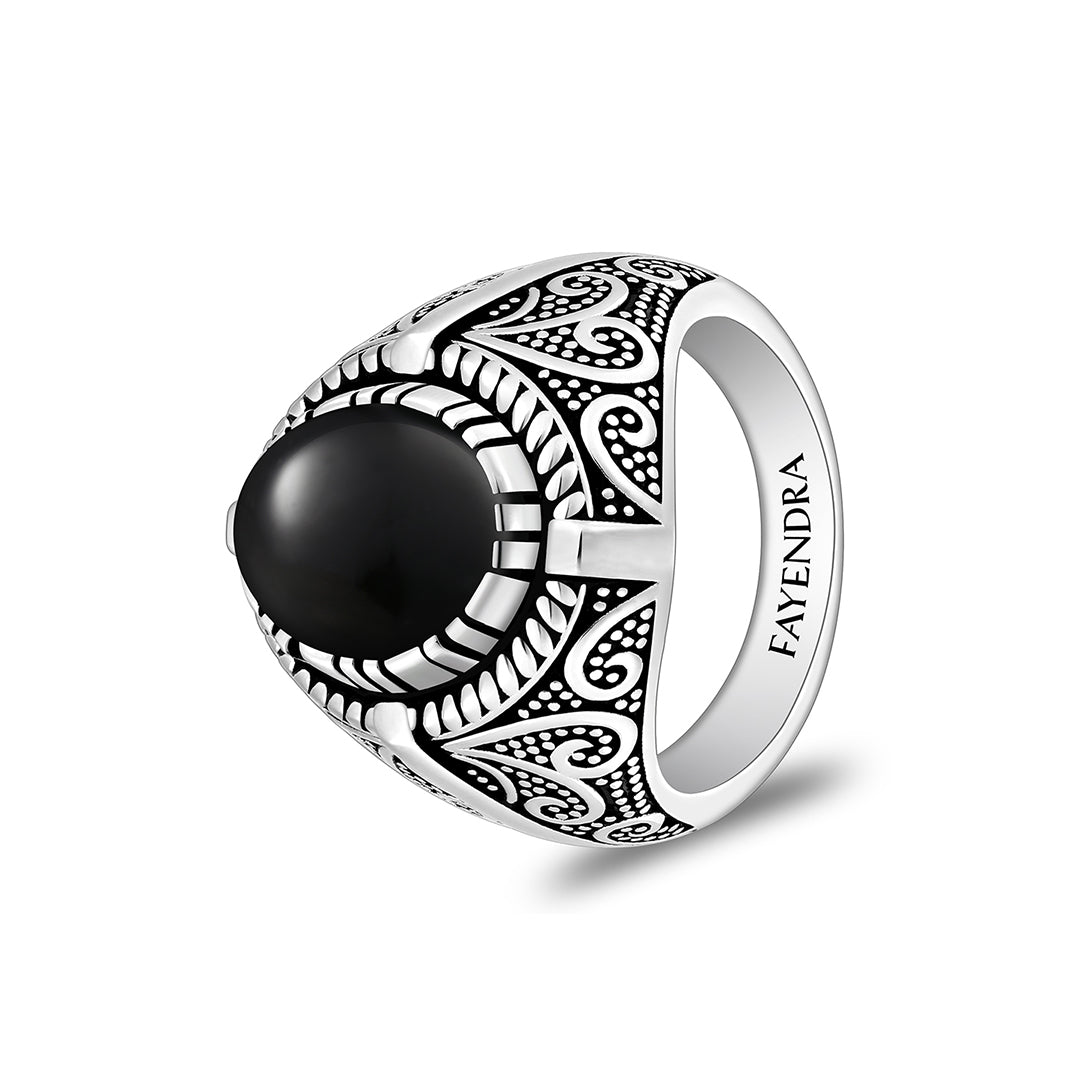 خاتم رجالي من الفضة الخالصة عيار 925 مطلي روديوم و اسود مرصع احجار عقيق اسود طبيعي كابشون