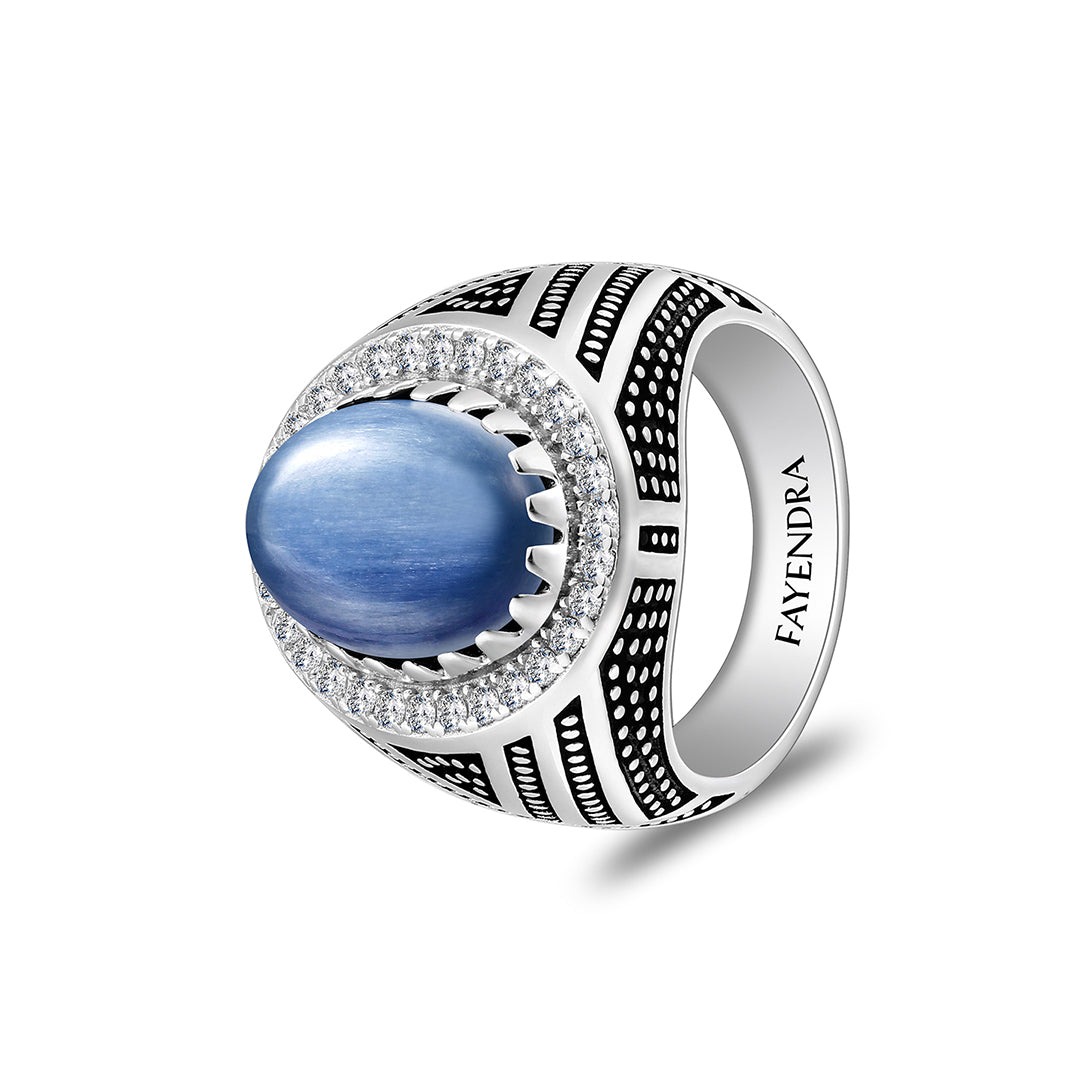 خاتم رجالي من الفضة الخالصة عيار 925 مطلي روديوم و اسود مرصع احجار كيانيت طبيعي كابشون و فص ابيض
