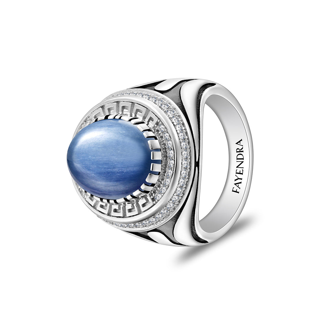خاتم رجالي من الفضة الخالصة عيار 925 مطلي روديوم و اسود مرصع احجار كيانيت طبيعي كابشون و فص ابيض
