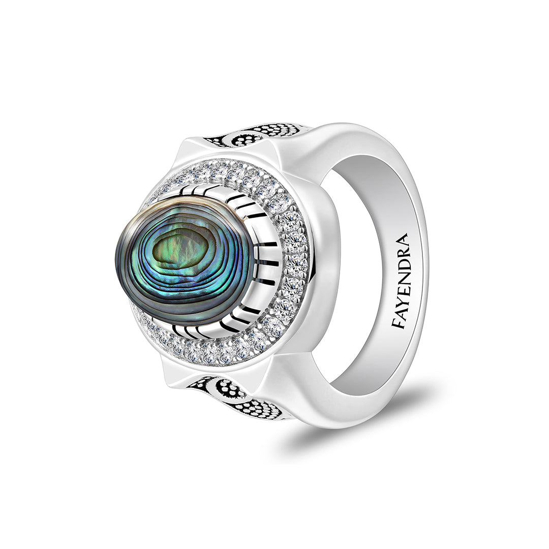 خاتم رجالي من الفضة الخالصة عيار 925 مطلي روديوم و اسود مرصع احجار صدف استرالي كابشون و فص ابيض