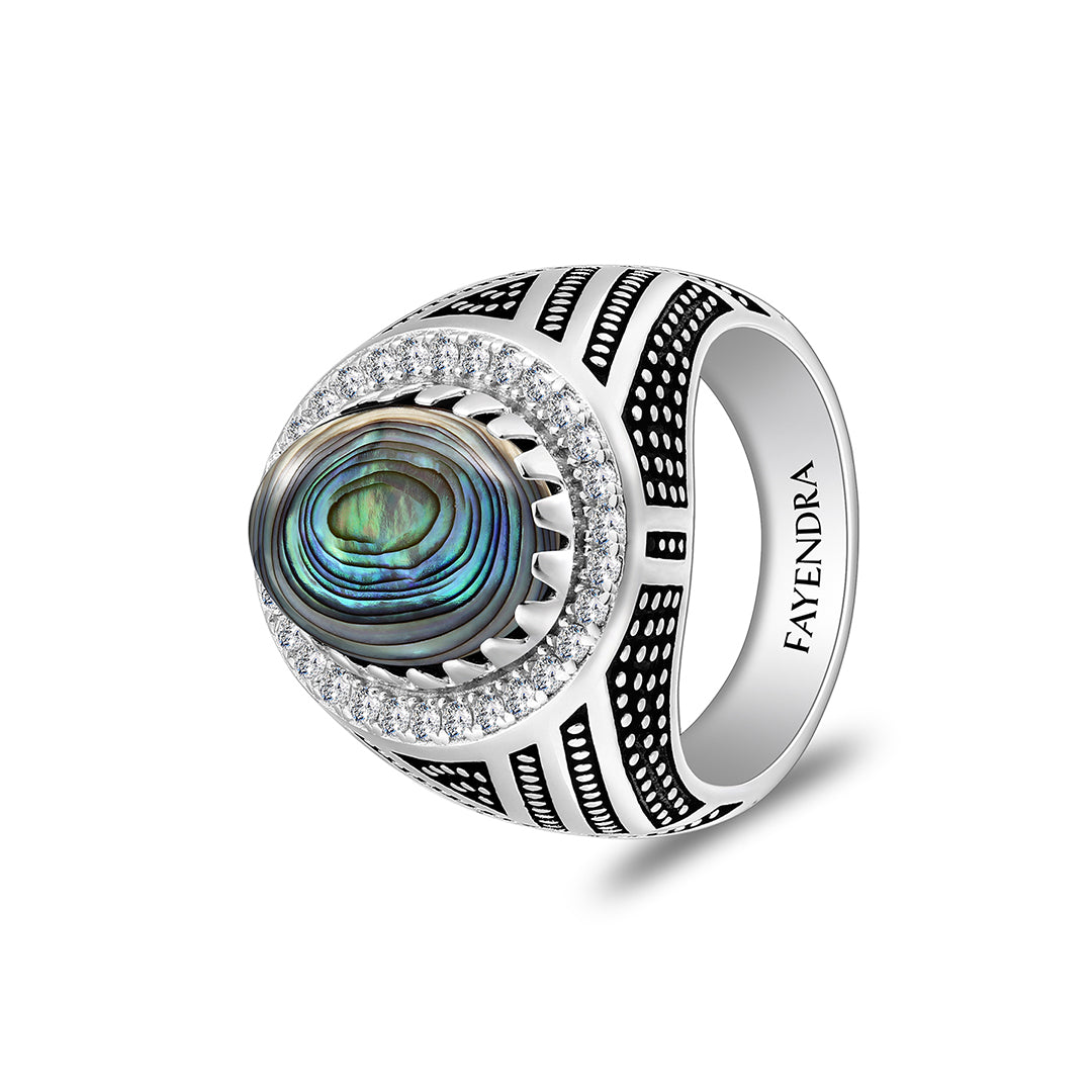 خاتم رجالي من الفضة الخالصة عيار 925 مطلي روديوم و اسود مرصع احجار صدف استرالي كابشون و فص ابيض