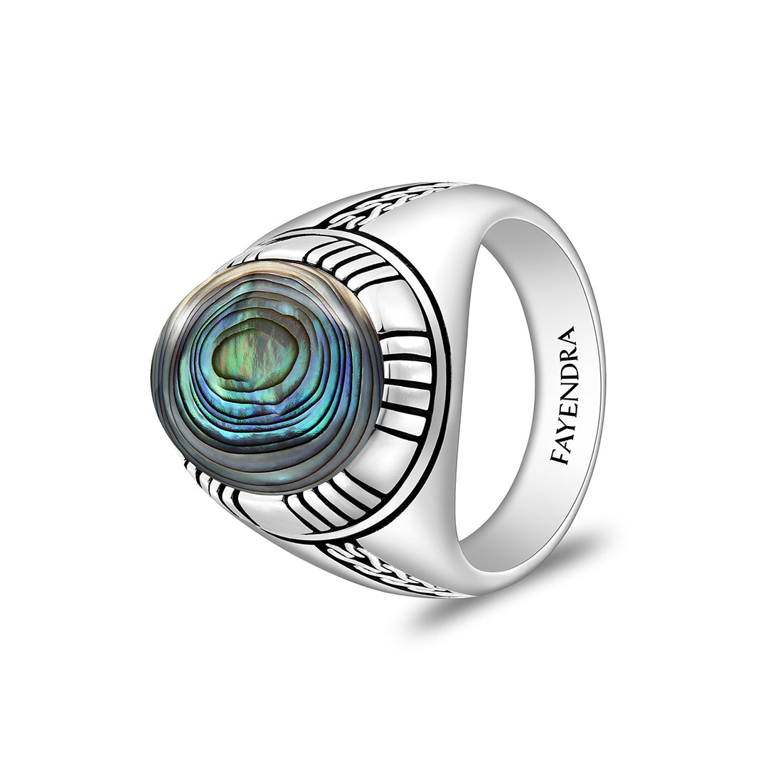 خاتم رجالي من الفضة الخالصة عيار 925 مطلي روديوم و اسود مرصع احجار صدف استرالي كابشون