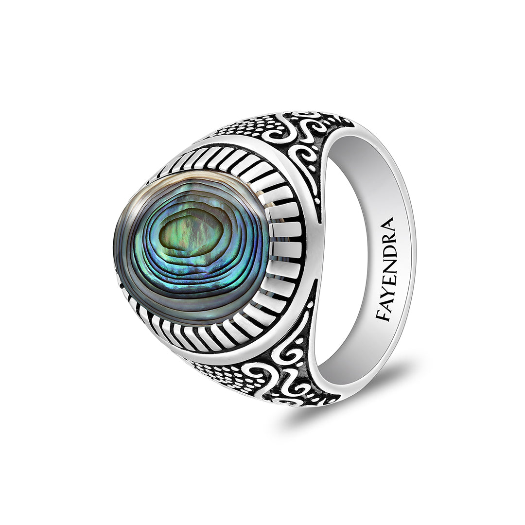 خاتم رجالي من الفضة الخالصة عيار 925 مطلي روديوم و اسود مرصع احجار صدف استرالي كابشون