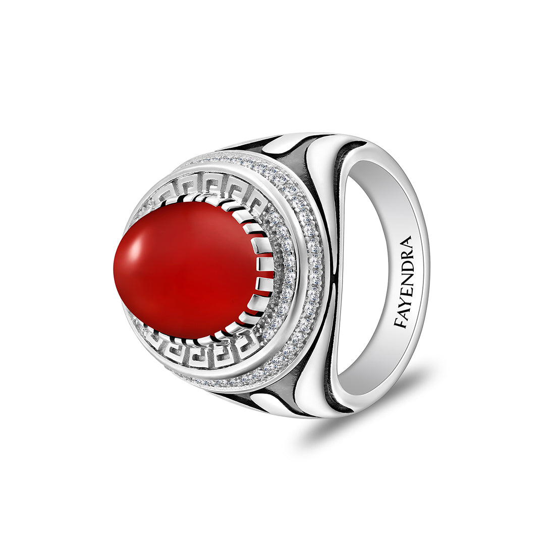 خاتم رجالي من الفضة الخالصة عيار 925 مطلي روديوم و اسود مرصع احجار عقيق احمر كابشون و فص ابيض