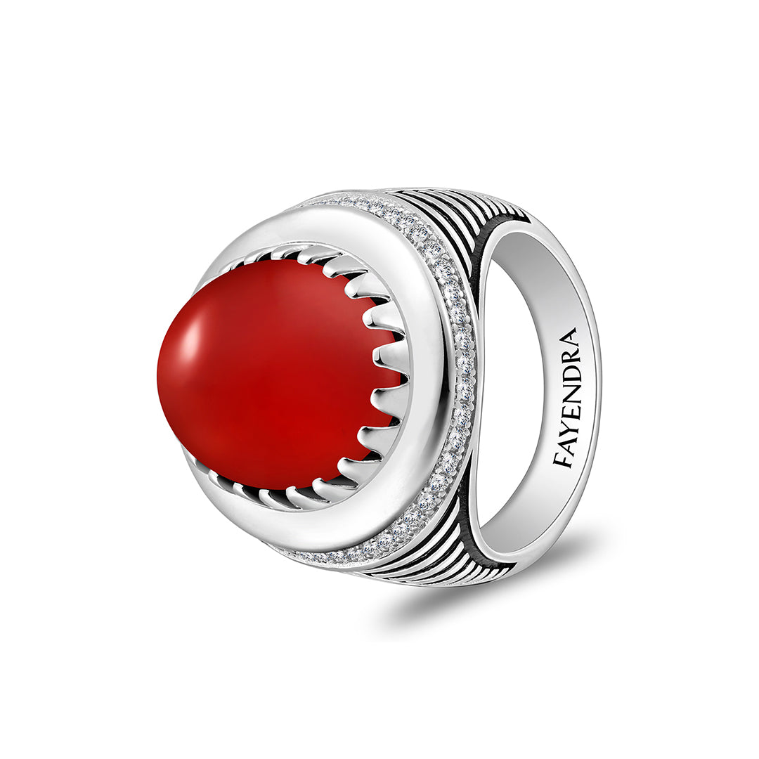 خاتم رجالي من الفضة الخالصة عيار 925 مطلي روديوم و اسود مرصع احجار عقيق احمر كابشون و فص ابيض