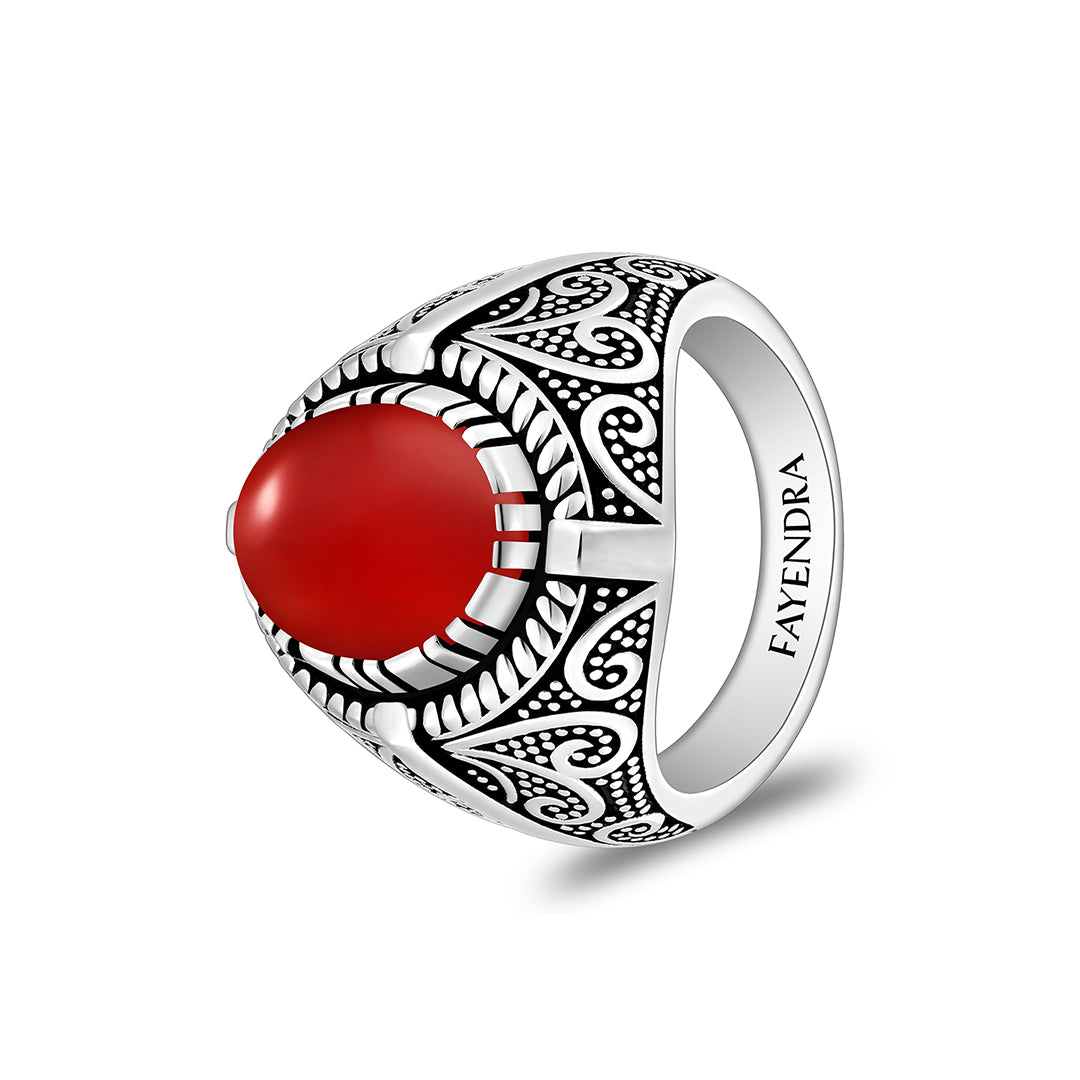 خاتم رجالي من الفضة الخالصة عيار 925 مطلي روديوم و اسود مرصع احجار عقيق احمر كابشون