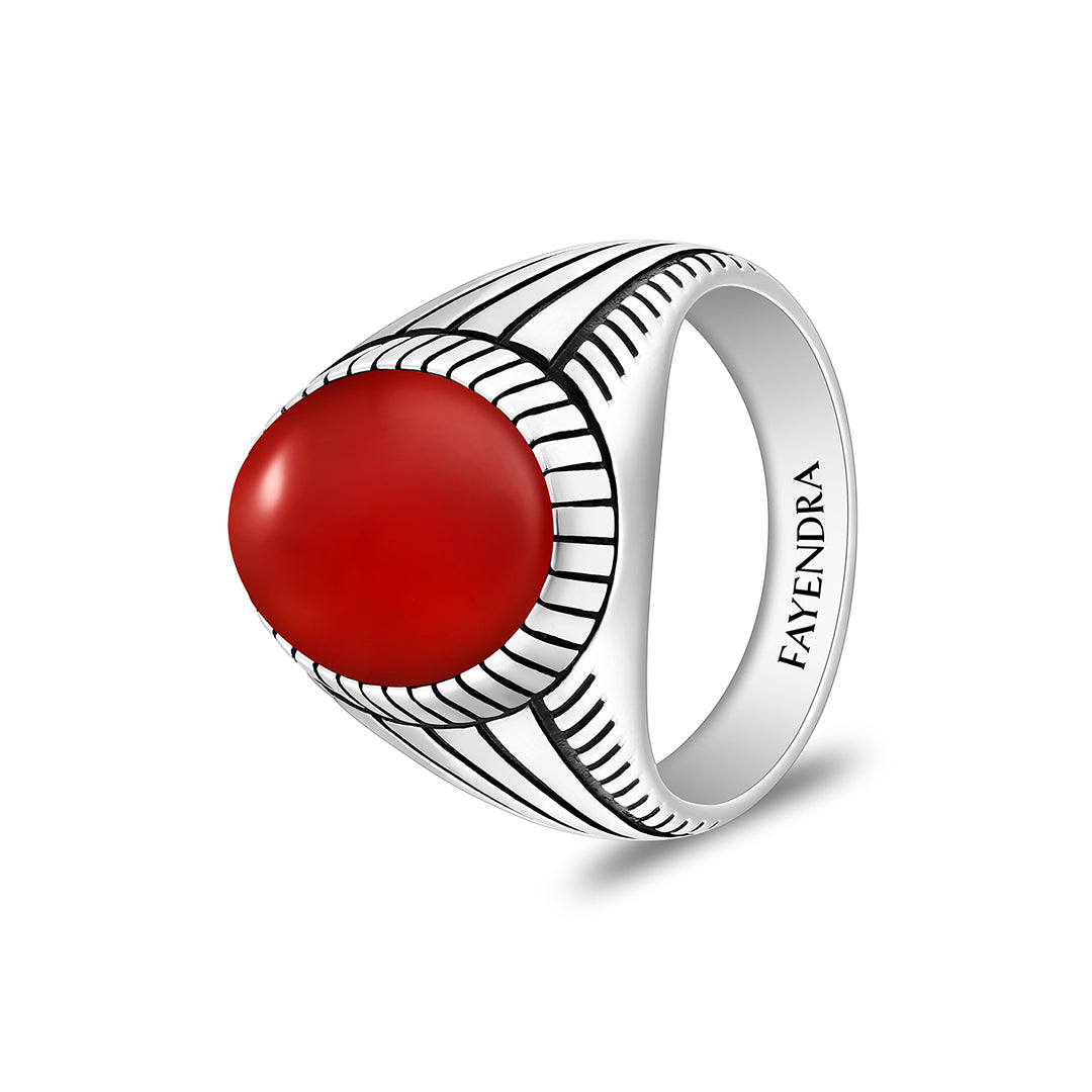 خاتم رجالي من الفضة الخالصة عيار 925 مطلي روديوم و اسود مرصع احجار عقيق احمر كابشون