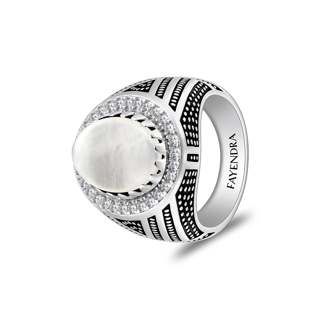 خاتم رجالي من الفضة الخالصة عيار 925 مطلي روديوم و اسود مرصع احجار صدف ابيض كابشون و فص ابيض