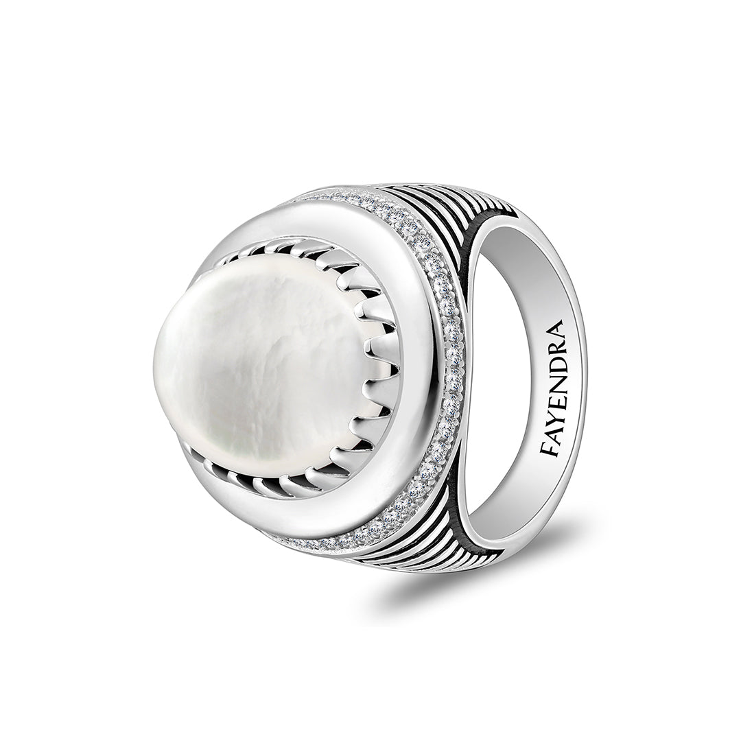 خاتم رجالي من الفضة الخالصة عيار 925 مطلي روديوم و اسود مرصع احجار صدف ابيض كابشون و فص ابيض