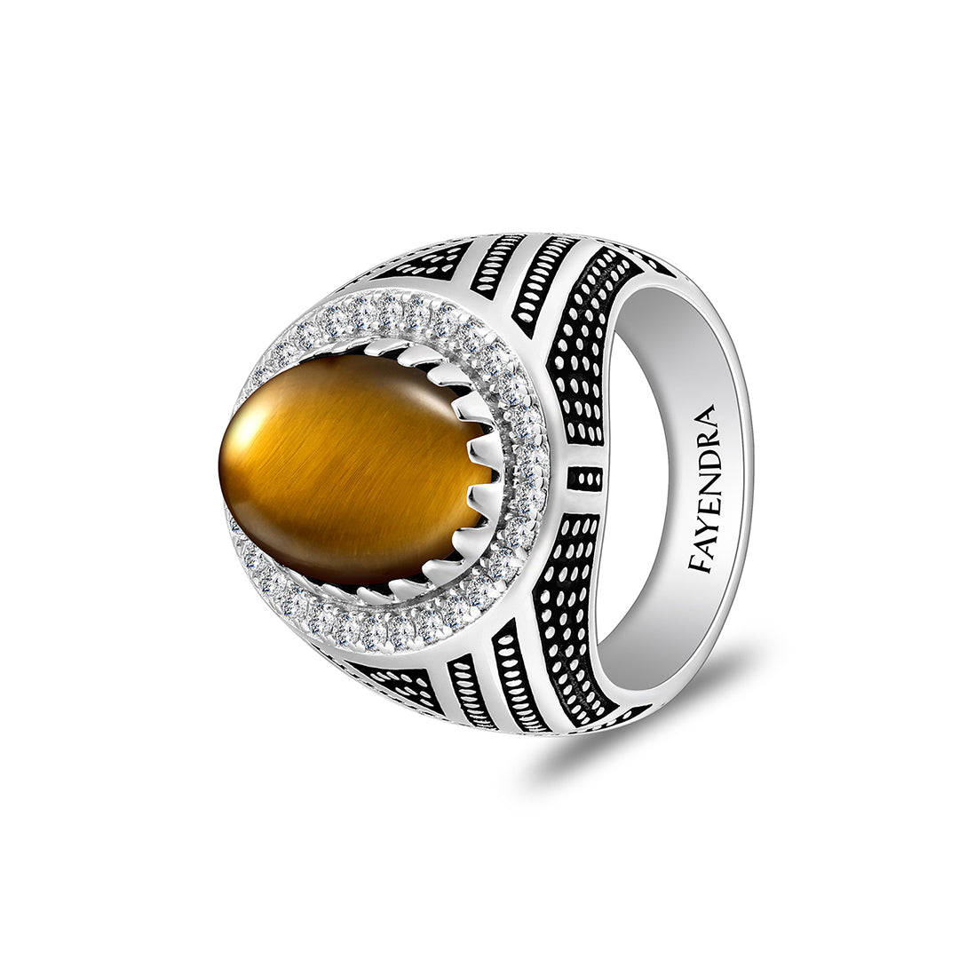خاتم رجالي من الفضة الخالصة عيار 925 مطلي روديوم و اسود مرصع احجار عين النمر اصفر كابشون و فص ابيض