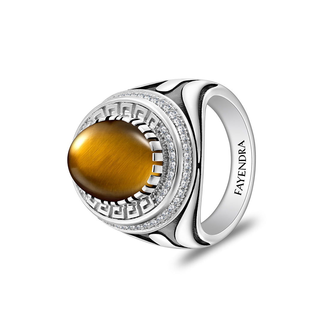 خاتم رجالي من الفضة الخالصة عيار 925 مطلي روديوم و اسود مرصع احجار عين النمر اصفر كابشون و فص ابيض