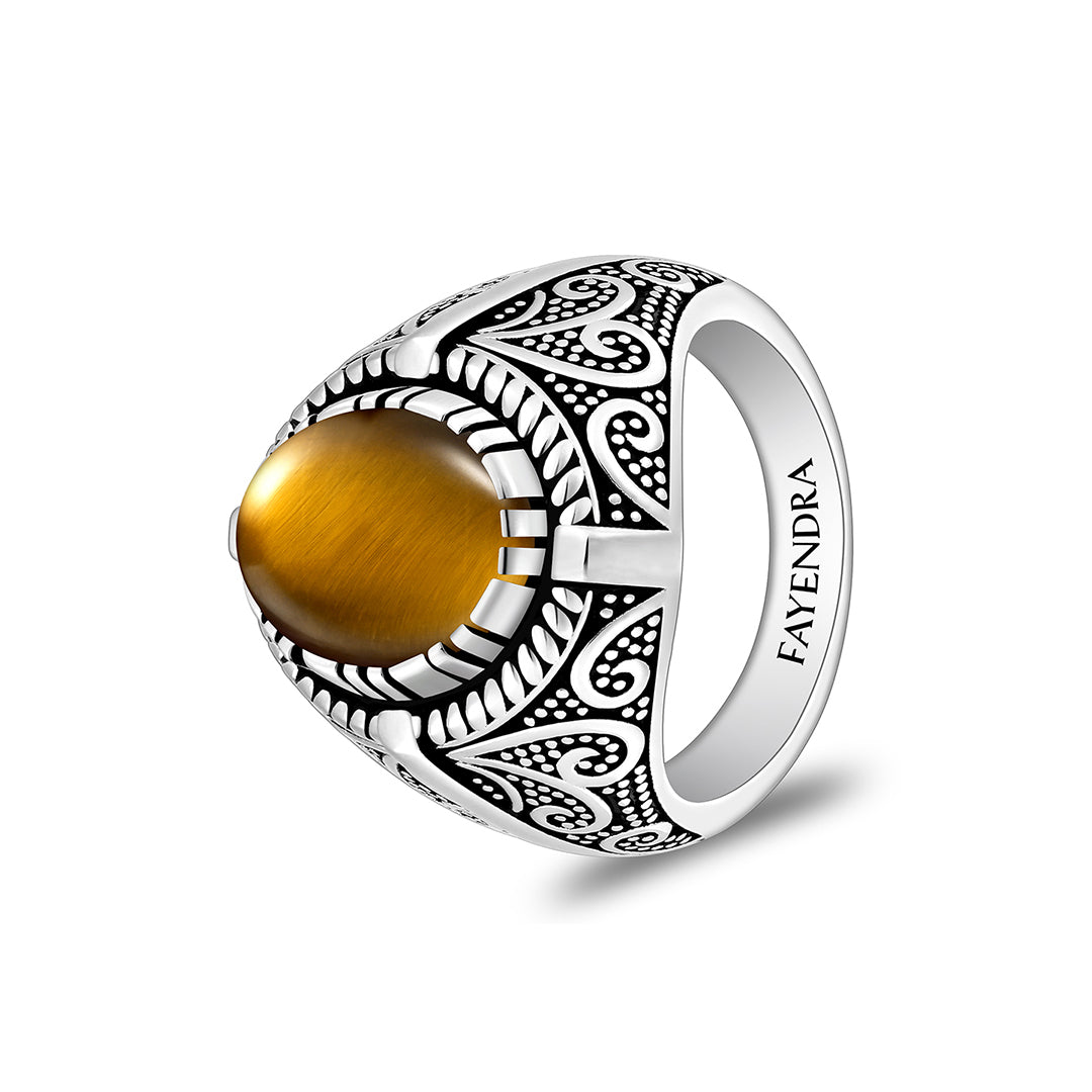 خاتم رجالي من الفضة الخالصة عيار 925 مطلي روديوم و اسود مرصع احجار عين النمر اصفر كابشون