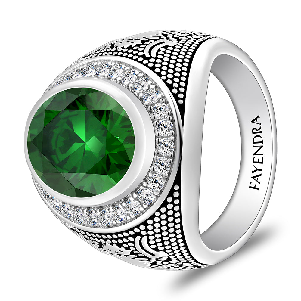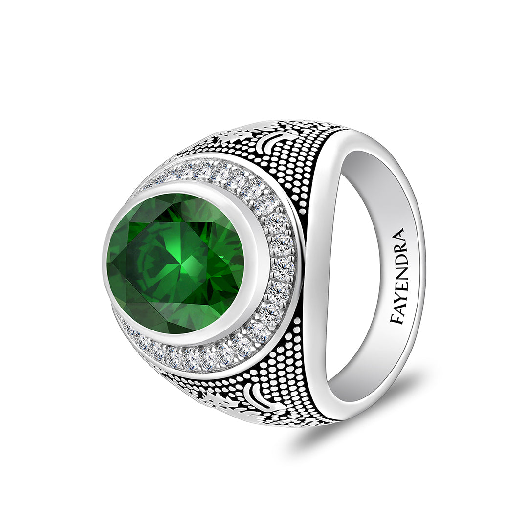 خاتم رجالي من الفضة الخالصة عيار 925 مطلي روديوم و اسود مرصع زركون زمردي و فص ابيض