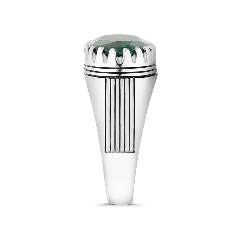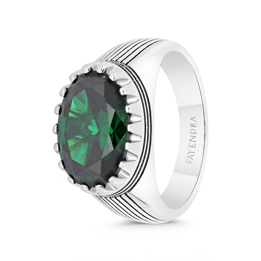 خاتم رجالي عالي الجودة ، مصنوع من الفضة الإسترلينية عيار 925 ، متوّج بحجر الزركون الزمردي الفاتن والمطلي بالروديوم لمزيد من المتانة واللمعان.