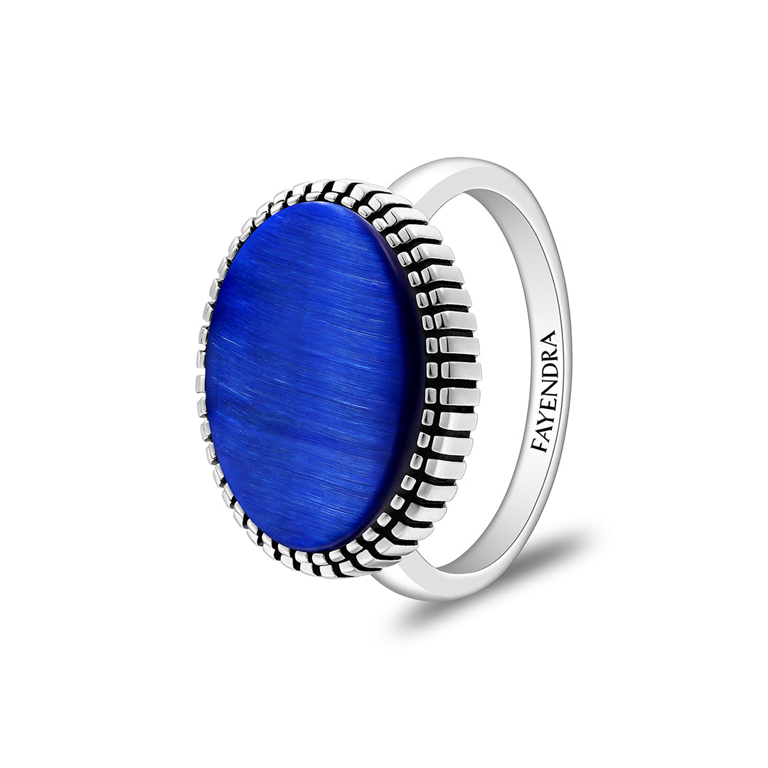 خاتم رجالي من الفضة الخالصة عيار 925 مطلي روديوم و اسود مرصع احجار عين النمر ازرق ملكي