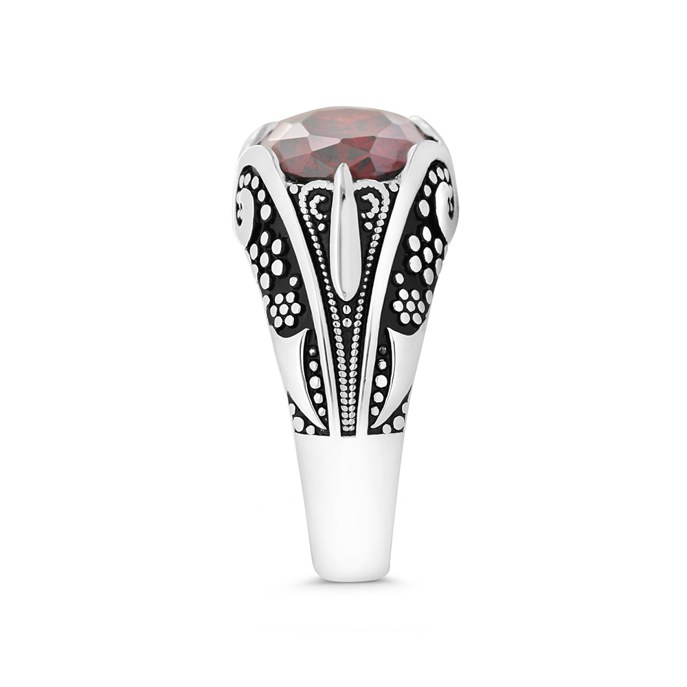 تمتع بفخامة الاقتناء مع هذا الخاتم المصمم بإبداع واستثنائية، خاتم فضة رجالي بتصميم بيضاوي مطعم بحجر جارنيت زركون وتزين معدنه زخارف بأشكال فنية باهرة.