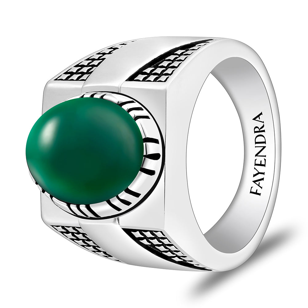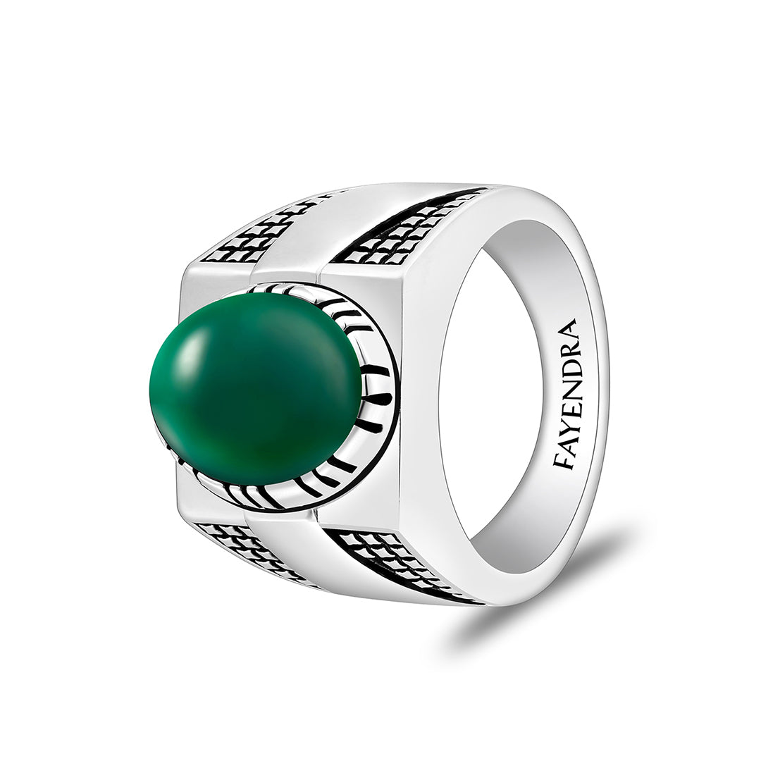خاتم رجالي من الفضة الخالصة عيار 925 مطلي روديوم و اسود مرصع احجار عقيق جاد اخضر كابشون