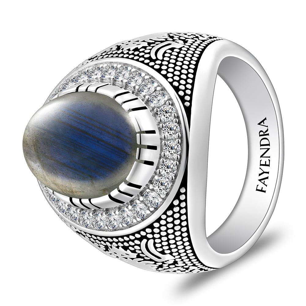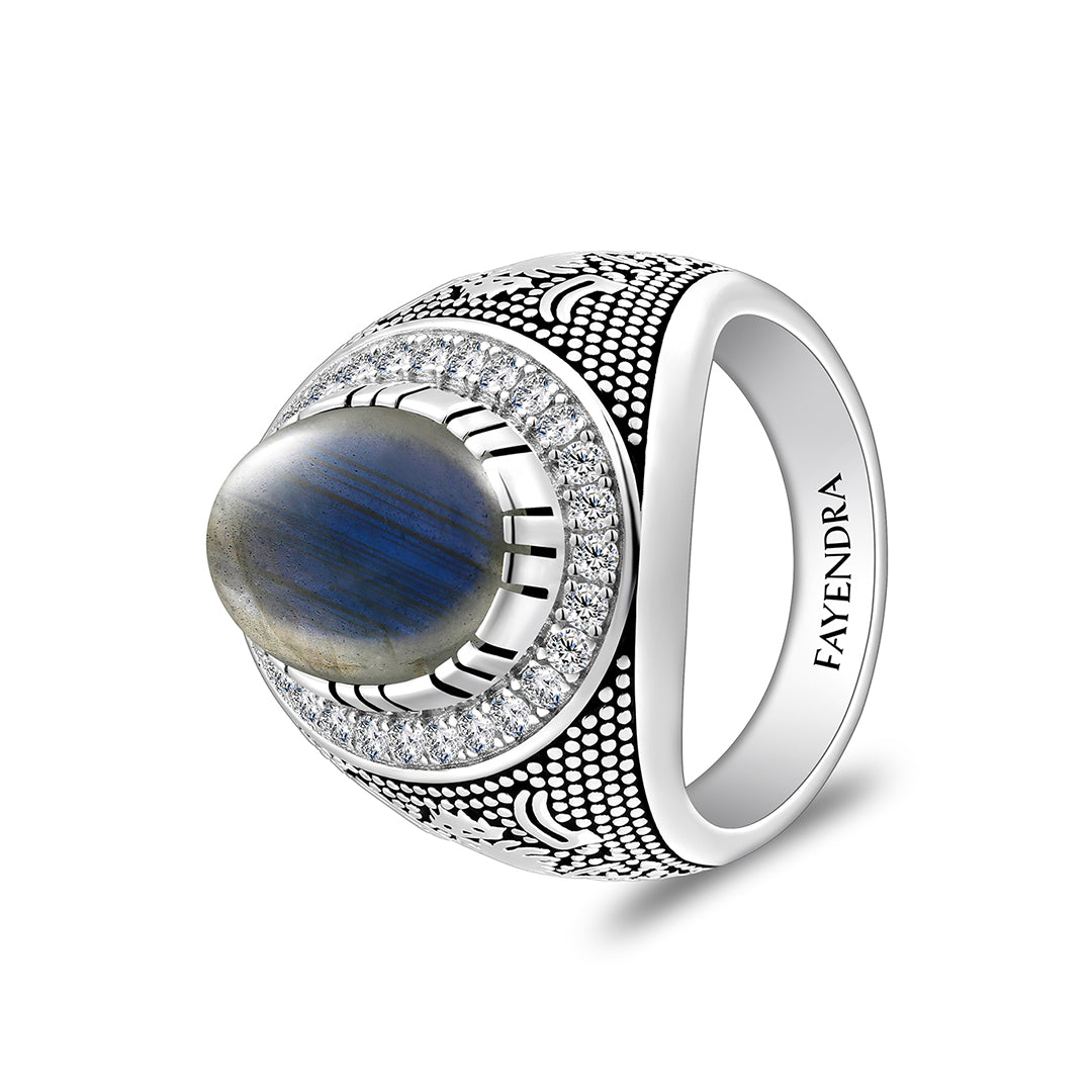 خاتم رجالي من الفضة الخالصة عيار 925 مطلي روديوم و اسود مرصع احجار لابرادوريت اوبالي كابشون وفص ابيض