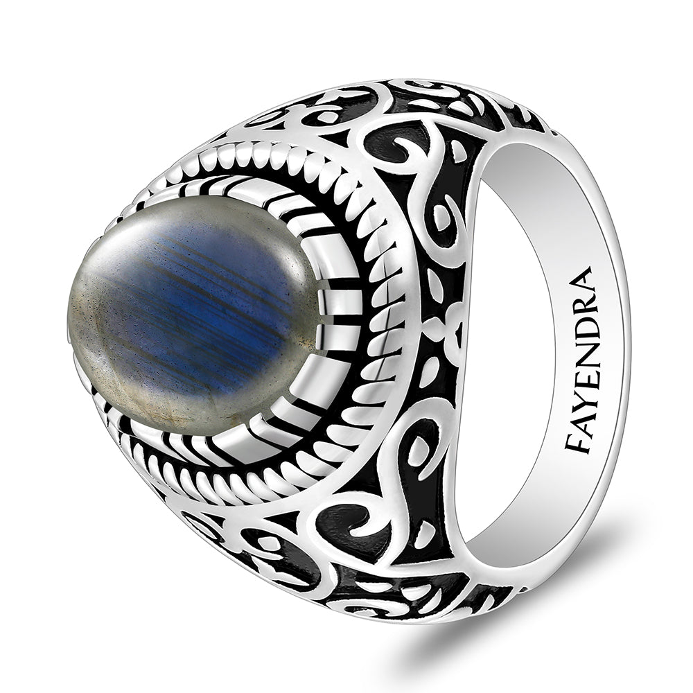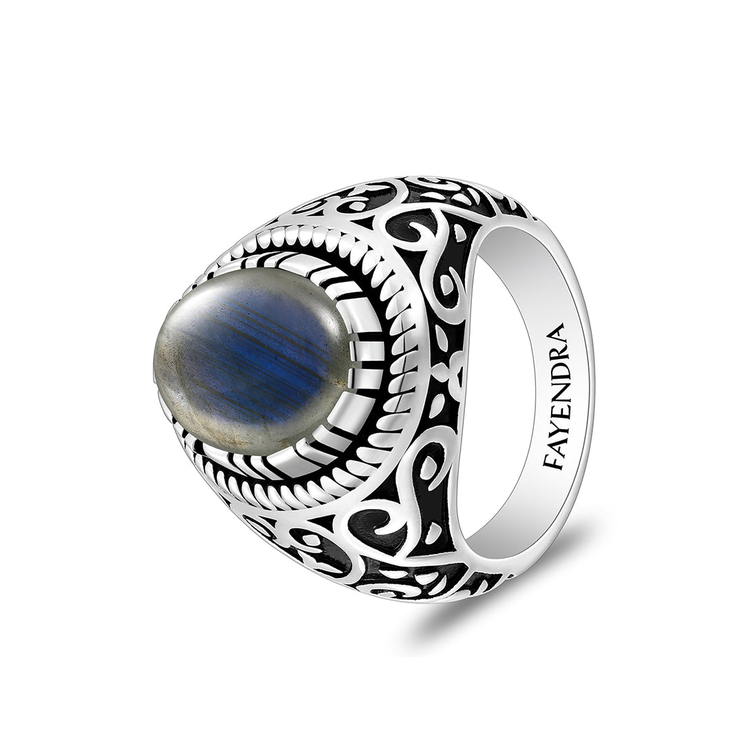خاتم رجالي من الفضة الخالصة عيار 925 مطلي روديوم و اسود مرصع احجار لابرادوريت اوبالي كابشون
