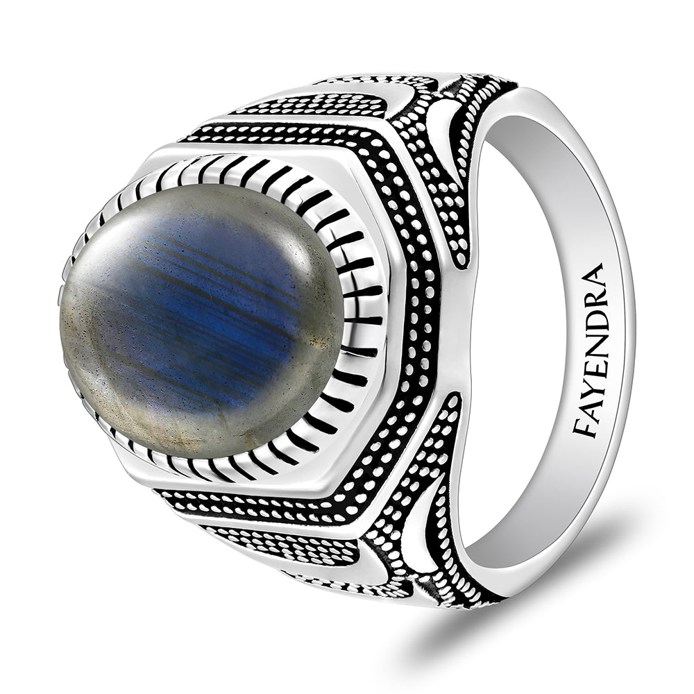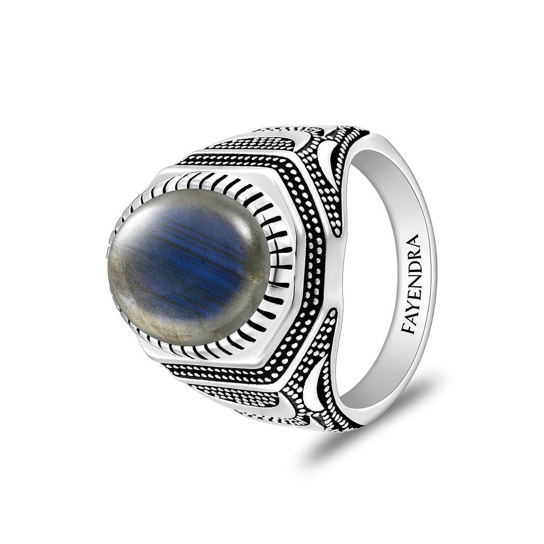 خاتم رجالي من الفضة الخالصة عيار 925 مطلي روديوم و اسود مرصع احجار لابرادوريت اوبالي كابشون