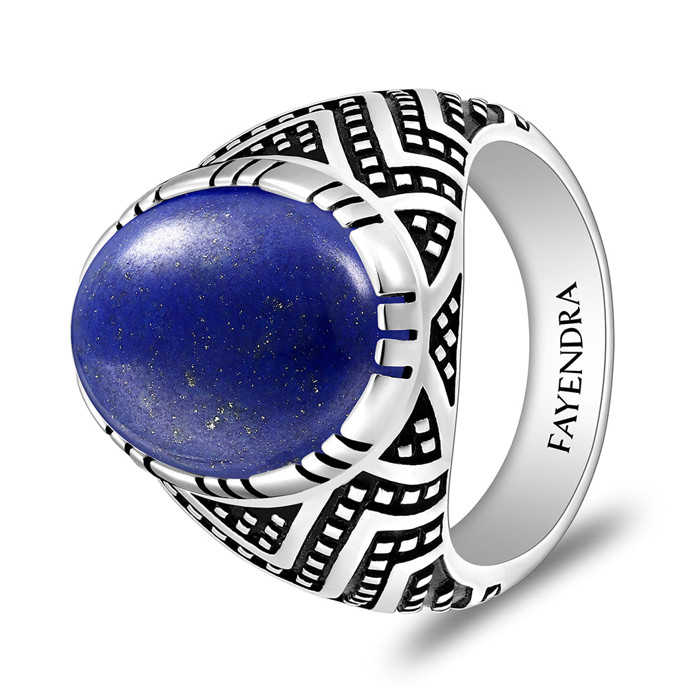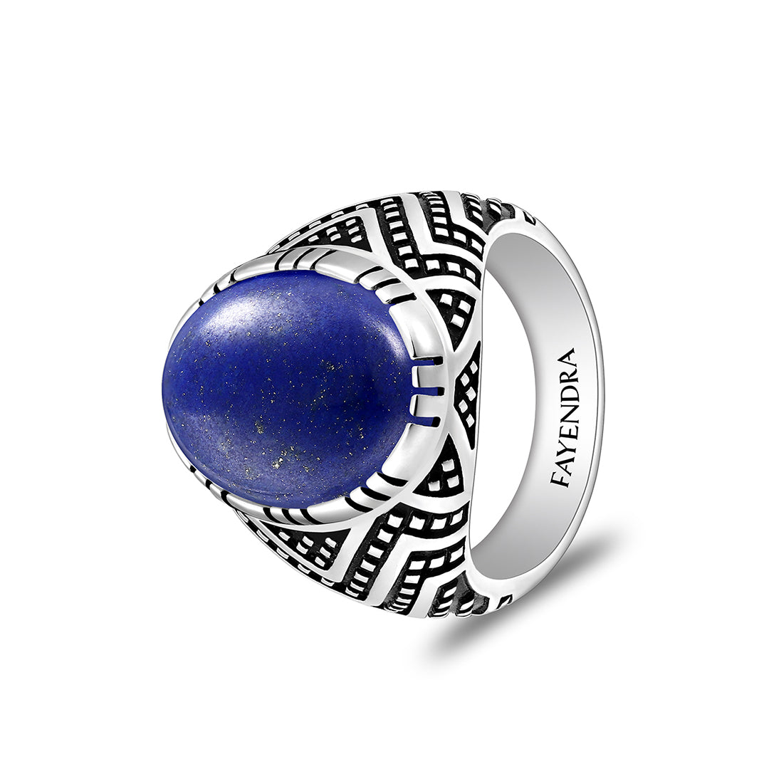 تجسّد صناعة فايندرا روح الإبداع اللامحدود والإتقان الفني الرفيع، ويترجم ذلك بوضوح من خلال هذا الخاتم الرائع، المصنوع من الفضة الخالصة عيار 925 والمطلي بالروديوم لمزيد من الحماية واللمعان. يتميز الخاتم بتصميم فريد مزدان بنقوش دقيقة من النقاط والخطوط المتقنة، بينما يتوسّطه حجر لابيس مصقول بقصّة كابشون المميزة، ما يمنحه توازنًا بصريًا رائعًا ويجسّد عراقة التصميم في كل تفصيلة. اقتنيه الآن وعبّر عن ذوقك الرفيع!