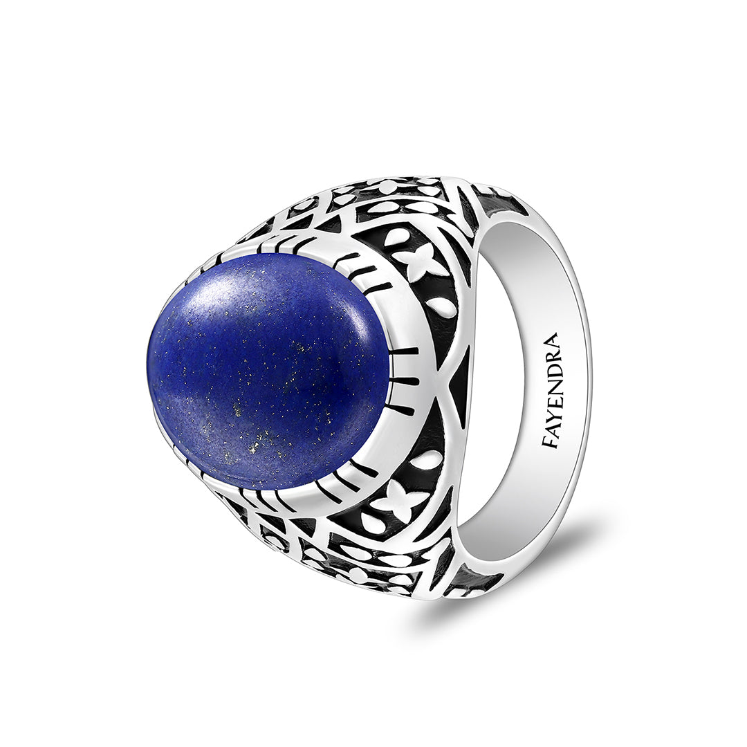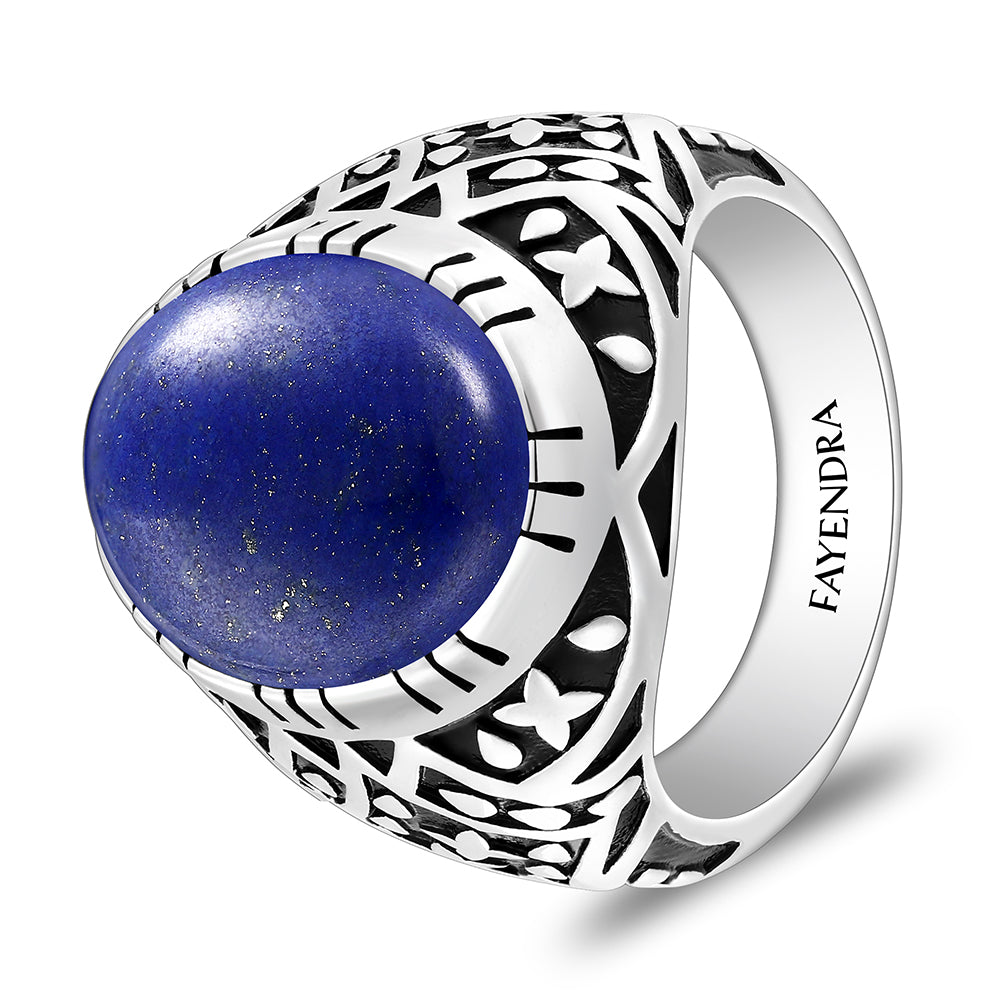 ارتقِ بذوقك إلى آفاق جديدة مع هذا الخاتم المميز من فايندرا، المصنوع من الفضة الخالصة عيار 925 والمطلي بالروديوم لمزيد من الحماية والبريق. يتألق بتصميم راقٍ يزدان بنقوش دقيقة باللون الأسود، تتنوع بين نقاط وتموجات ورسوم هندسية فريدة، تمنحه لمسة أصيلة تستحضر عبق الماضي الجميل. وفي قلب هذا الإبداع يتربع حجر لابيس بقصة كابشون مذهلة، ليضفي على الخاتم حضورًا مهيبًا ويعكس ذوقك الرفيع. اقتنه الآن وأضف لمظهرك لمسة من الفخامة الخالدة! ملاحظة : قد تختلف درجة لون الحجر عن الصورة المعروضة على الموقع وذلك لان الأحجار طبيعية.