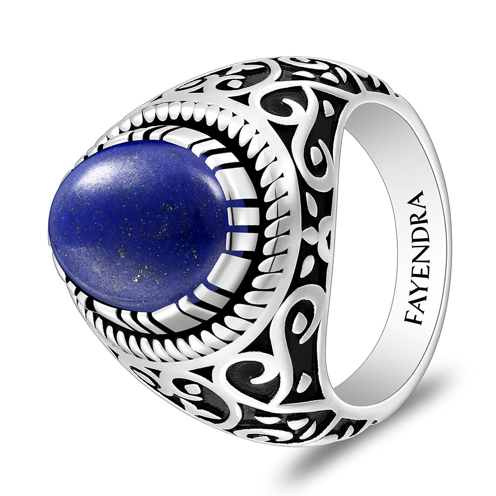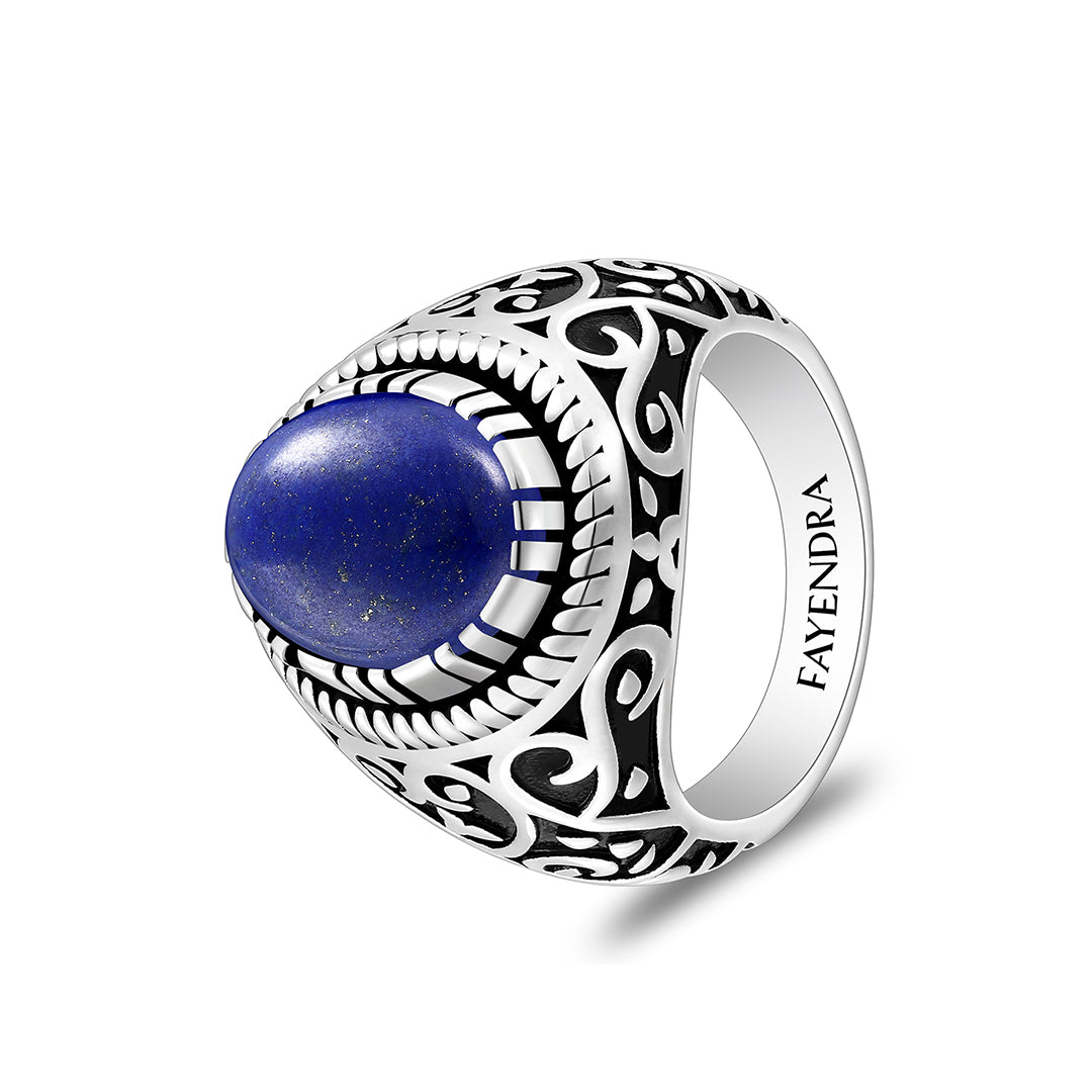 خاتم رجالي من الفضة الخالصة عيار925 مطلي روديوم و اسود مرصع حجر لابيس كابشون
