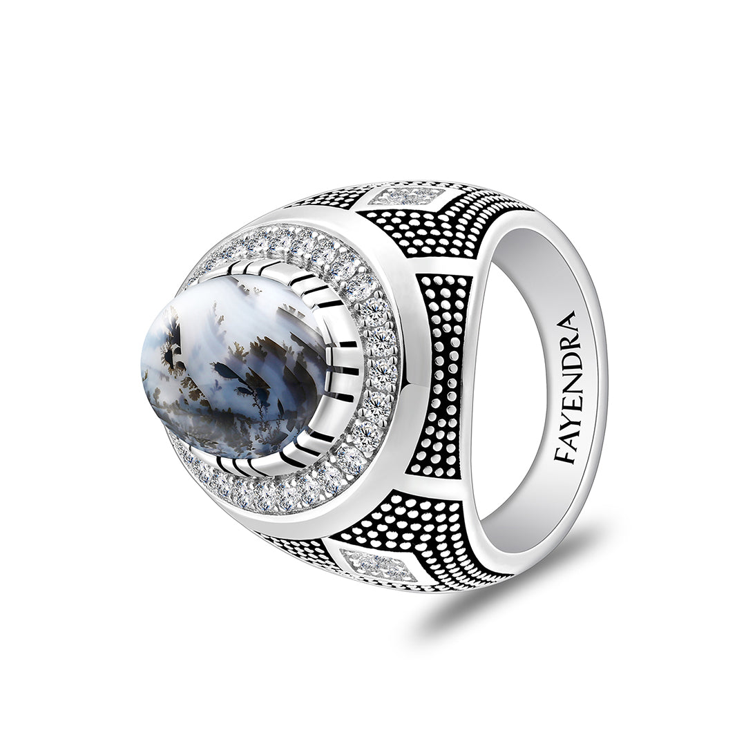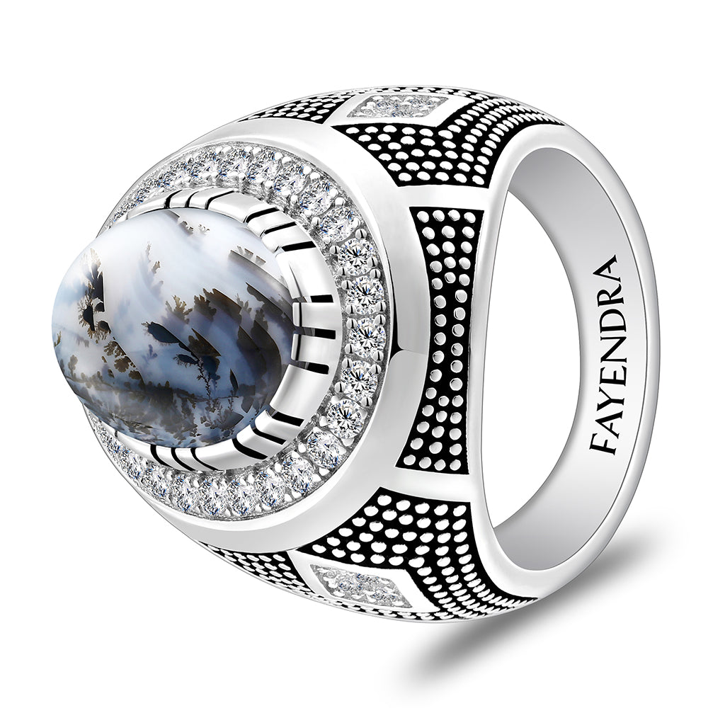 خاتم رجالي من الفضة الخالصة عيار 925 مطلي روديوم و اسود مرصع احجار عقيق مشجر طبيعي كابشون و فص ابيض