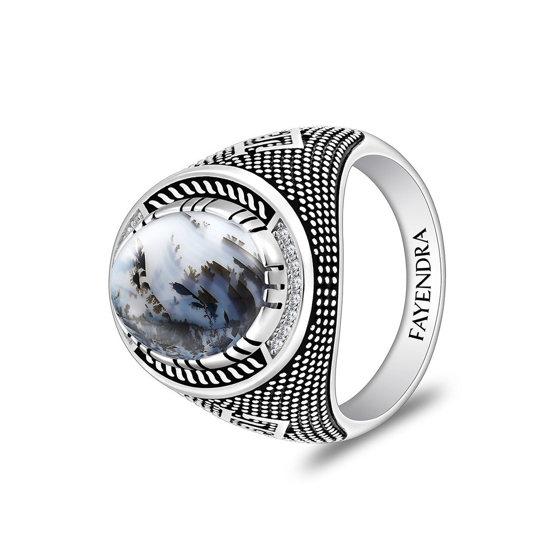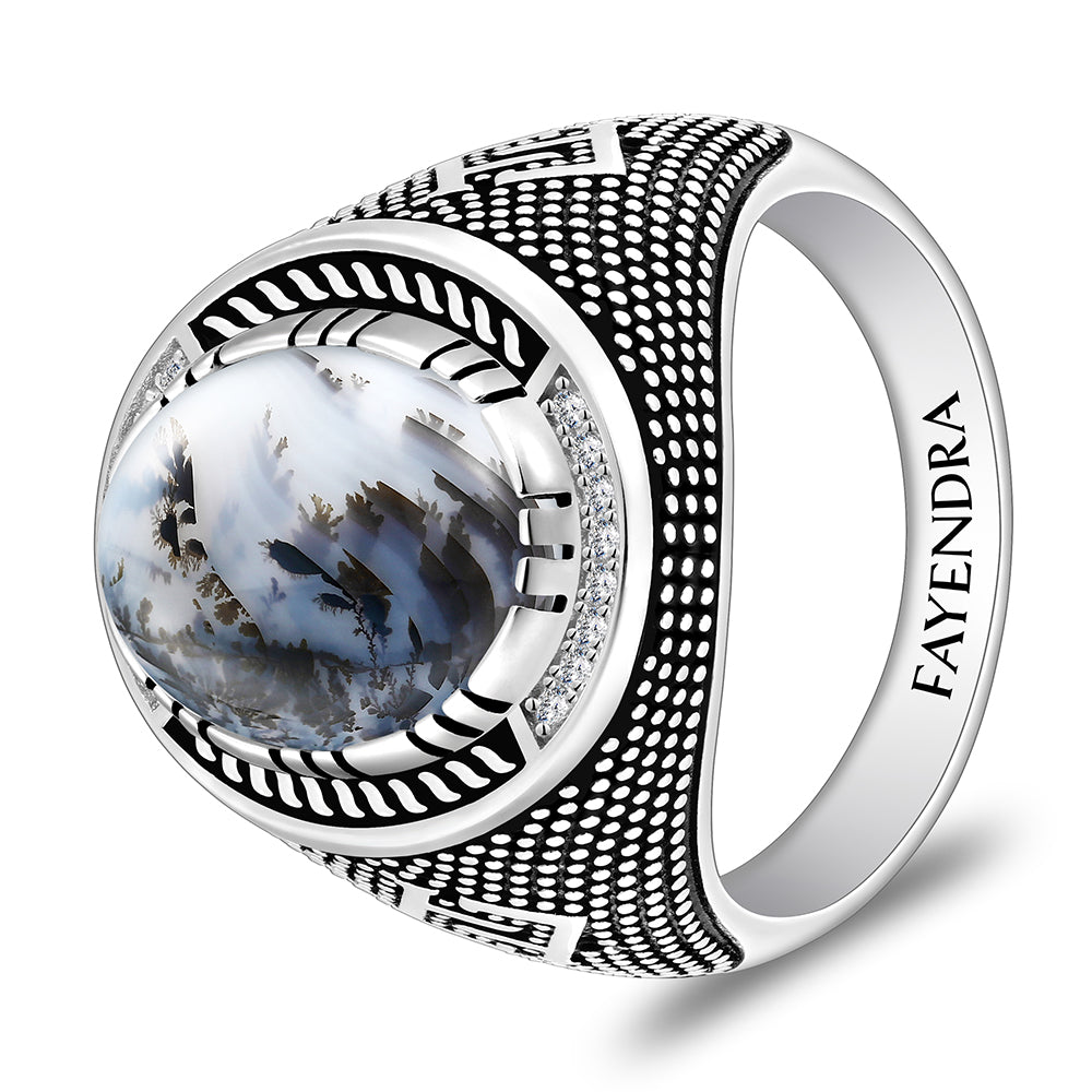 خاتم رجالي من الفضة الخالصة عيار 925 مطلي روديوم و اسود مرصع احجار عقيق مشجر طبيعي كابشون و فص ابيض