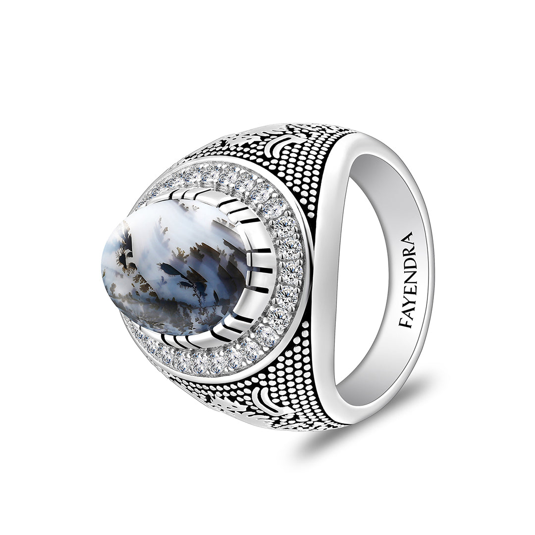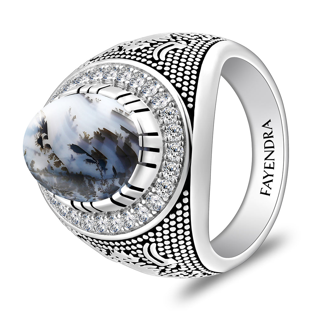 خاتم رجالي من الفضة الخالصة عيار 925 مطلي روديوم و اسود مرصع احجار عقيق مشجر طبيعي كابشون و فص ابيض