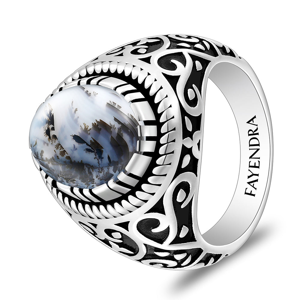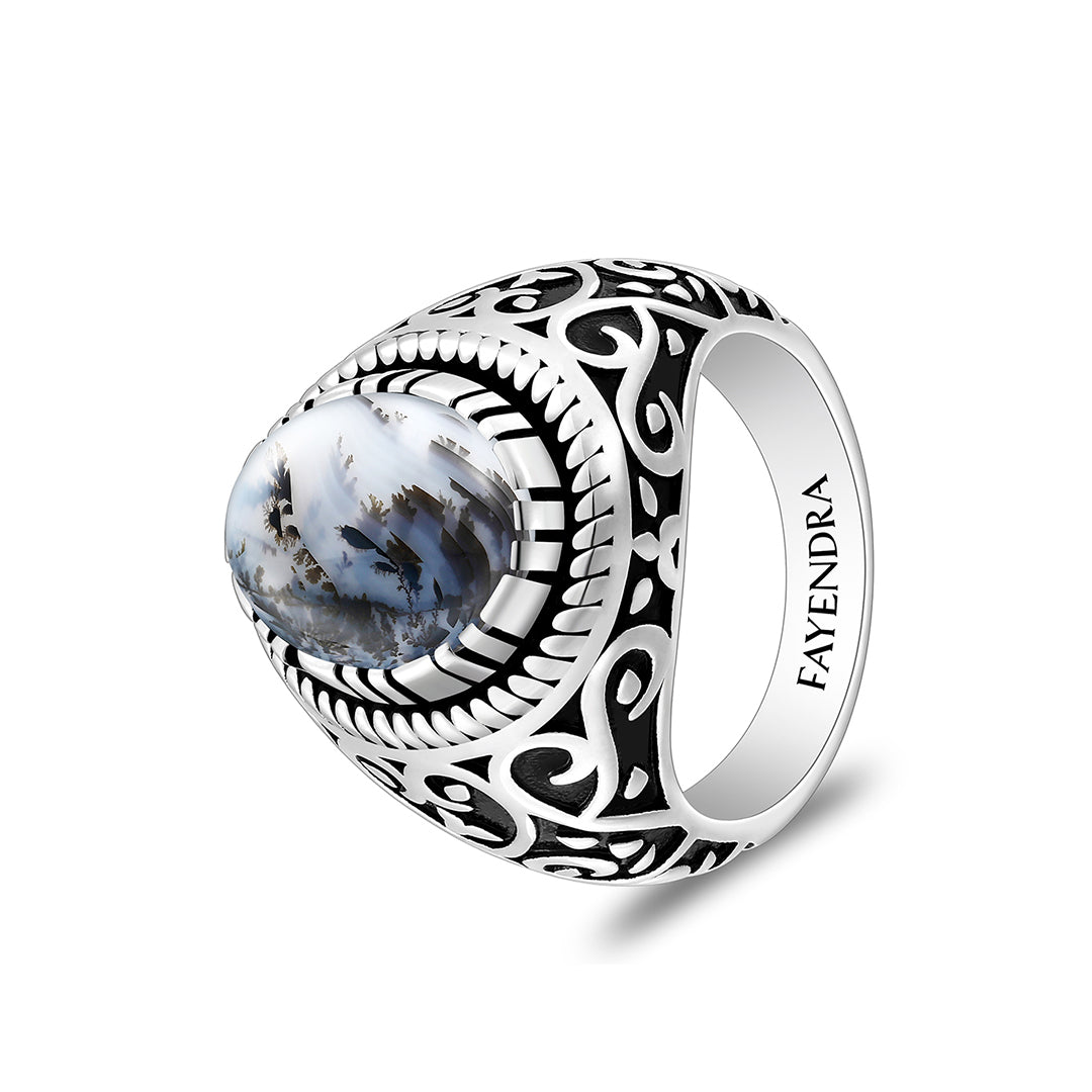 خاتم رجالي من الفضة الخالصة عيار 925 مطلي روديوم و اسود مرصع احجار عقيق مشجر طبيعي كابشون