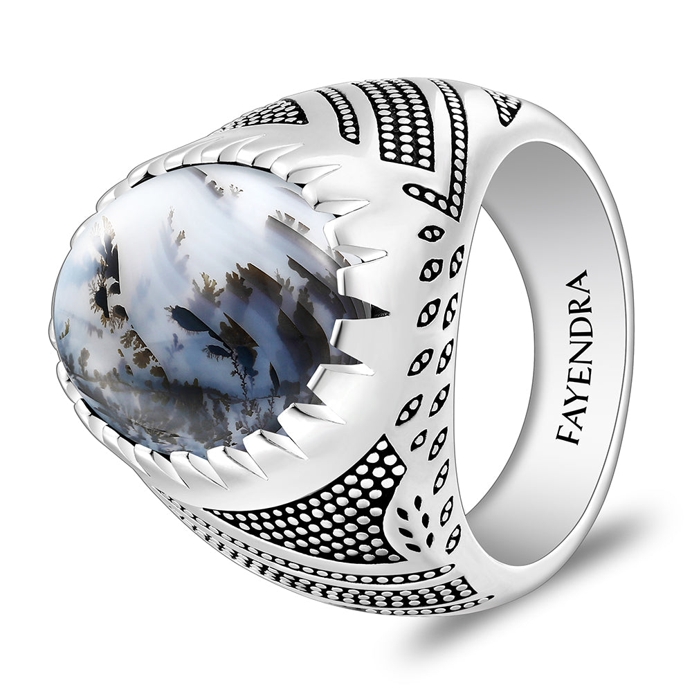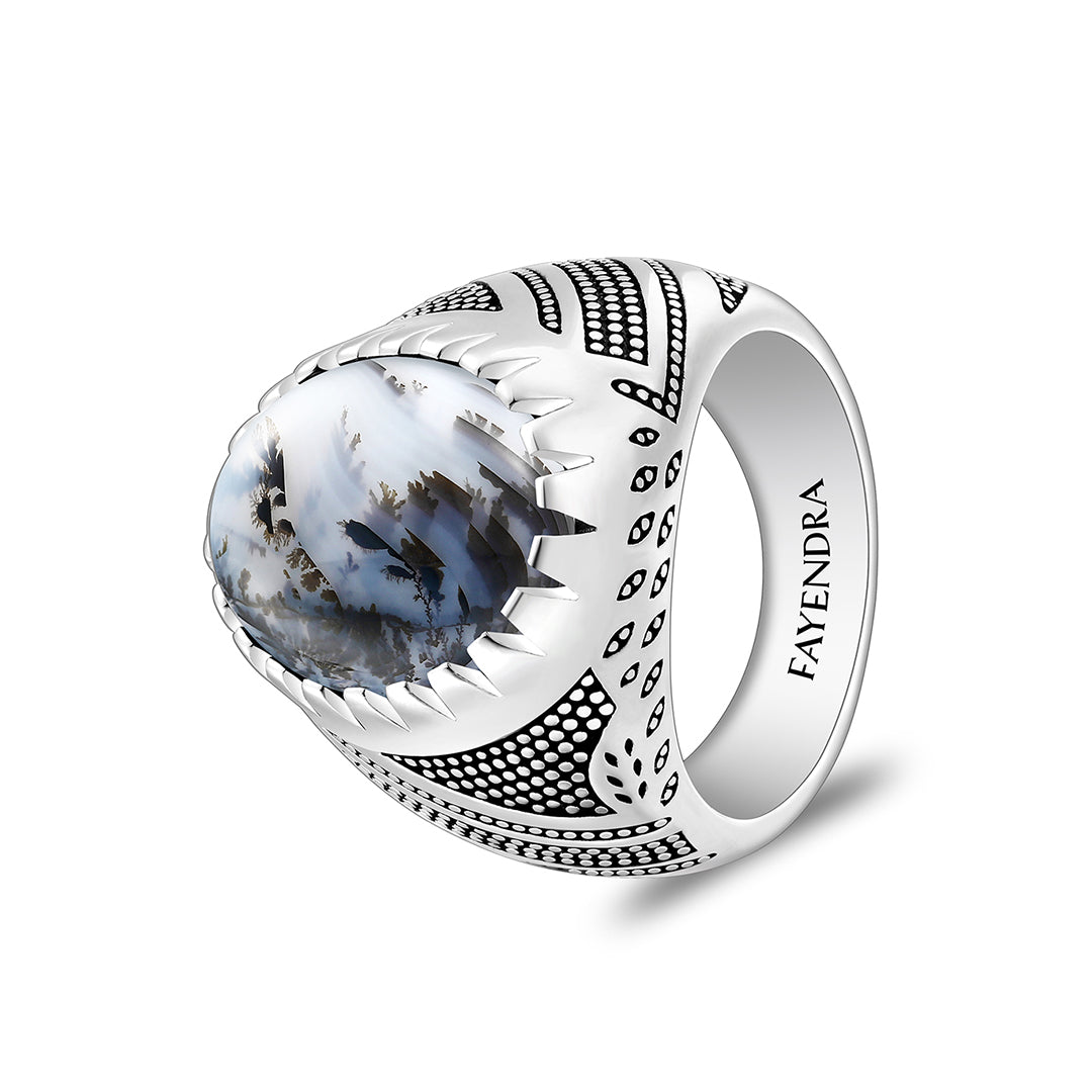خاتم رجالي من الفضة الخالصة عيار 925 مطلي روديوم و اسود مرصع احجار عقيق مشجر طبيعي كابشون