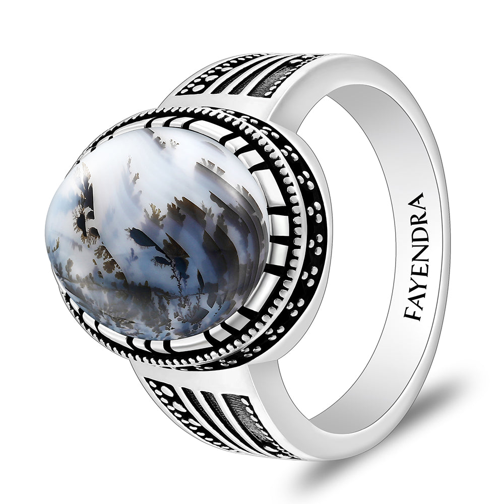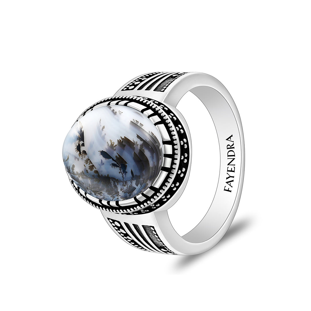 خاتم رجالي من الفضة الخالصة عيار 925 مطلي روديوم و اسود مرصع احجار عقيق مشجر طبيعي كابشون
