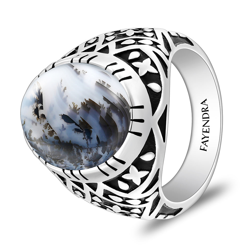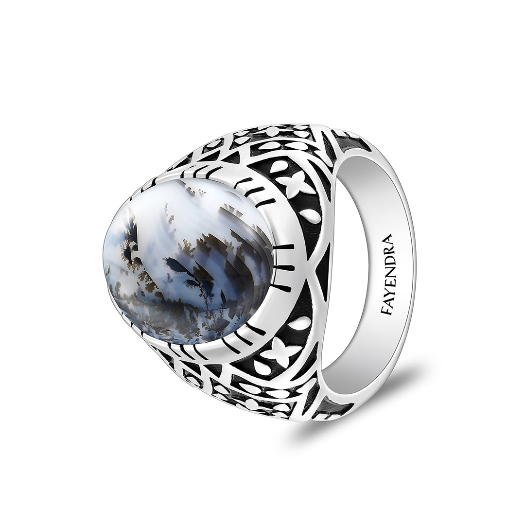 خاتم رجالي من الفضة الخالصة عيار 925 مطلي روديوم و اسود مرصع احجار عقيق مشجر طبيعي كابشون