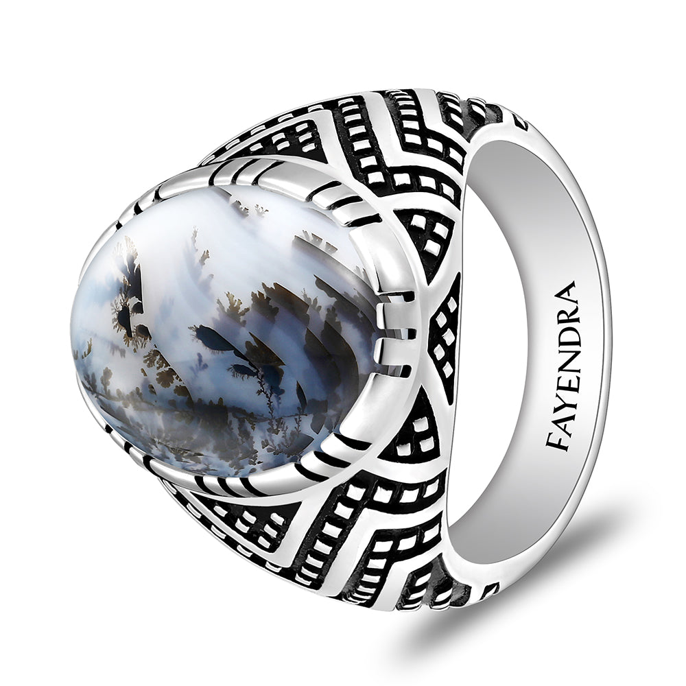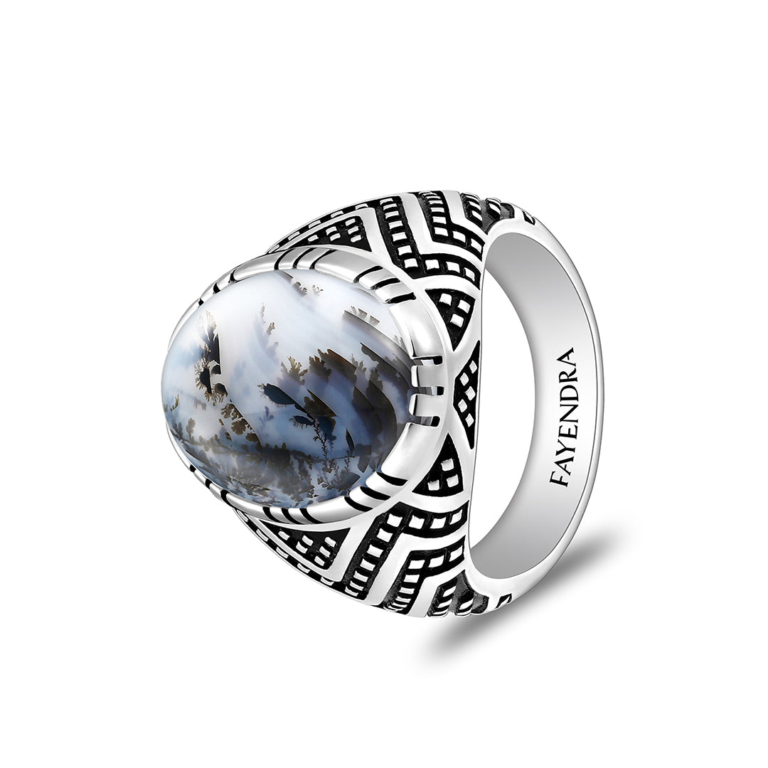 تجسّد صناعة فايندرا روح الإبداع اللامحدود والإتقان الفني الرفيع، ويترجم ذلك بوضوح من خلال هذا الخاتم الرائع، المصنوع من الفضة الخالصة عيار 925 والمطلي بالروديوم لمزيد من الحماية واللمعان. يتميز الخاتم بتصميم فريد مزدان بنقوش دقيقة من النقاط والخطوط المتقنة، بينما يتوسّطه حجر عقيق مشجر طبيعي مصقول بقصّة كابشون المميزة، ما يمنحه توازنًا بصريًا رائعًا ويجسّد عراقة التصميم في كل تفصيلة. اقتنيه الآن وعبّر عن ذوقك الرفيع!