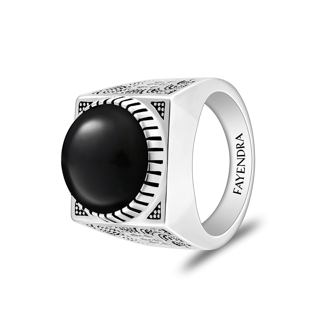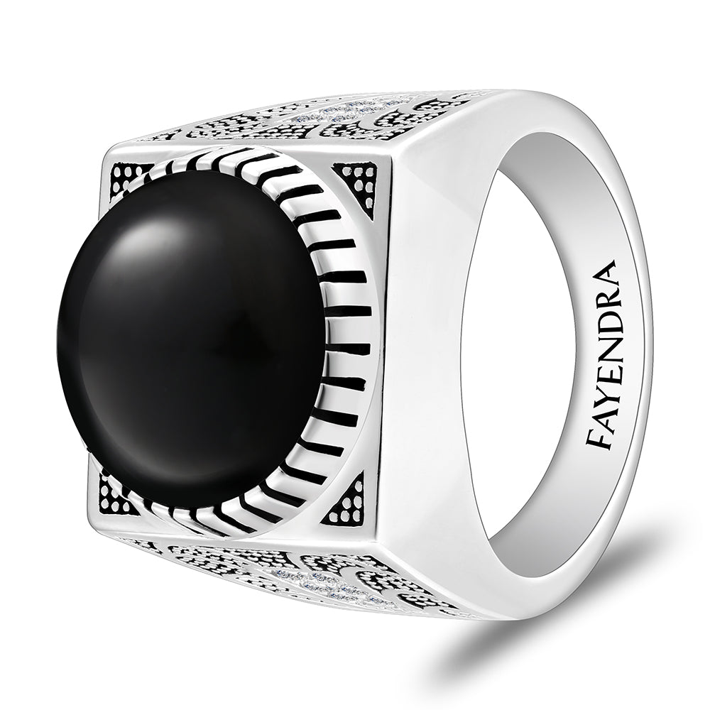 خاتم رجالي من الفضة الخالصة عيار 925 مطلي روديوم و اسود مرصع احجار عقيق اسود طبيعي كابشون و فص ابيض