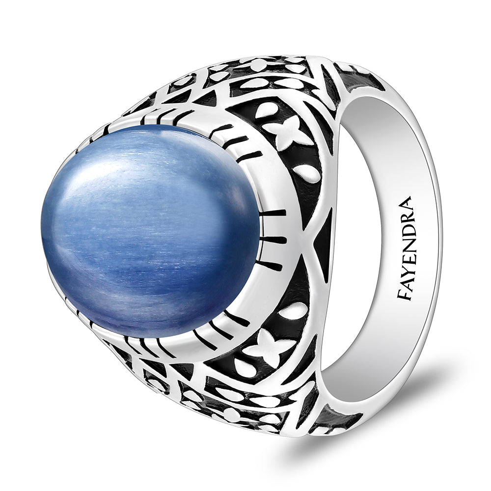 خاتم رجالي من الفضة الخالصة عيار 925 مطلي روديوم و اسود مرصع احجار كيانيت طبيعي كابشون