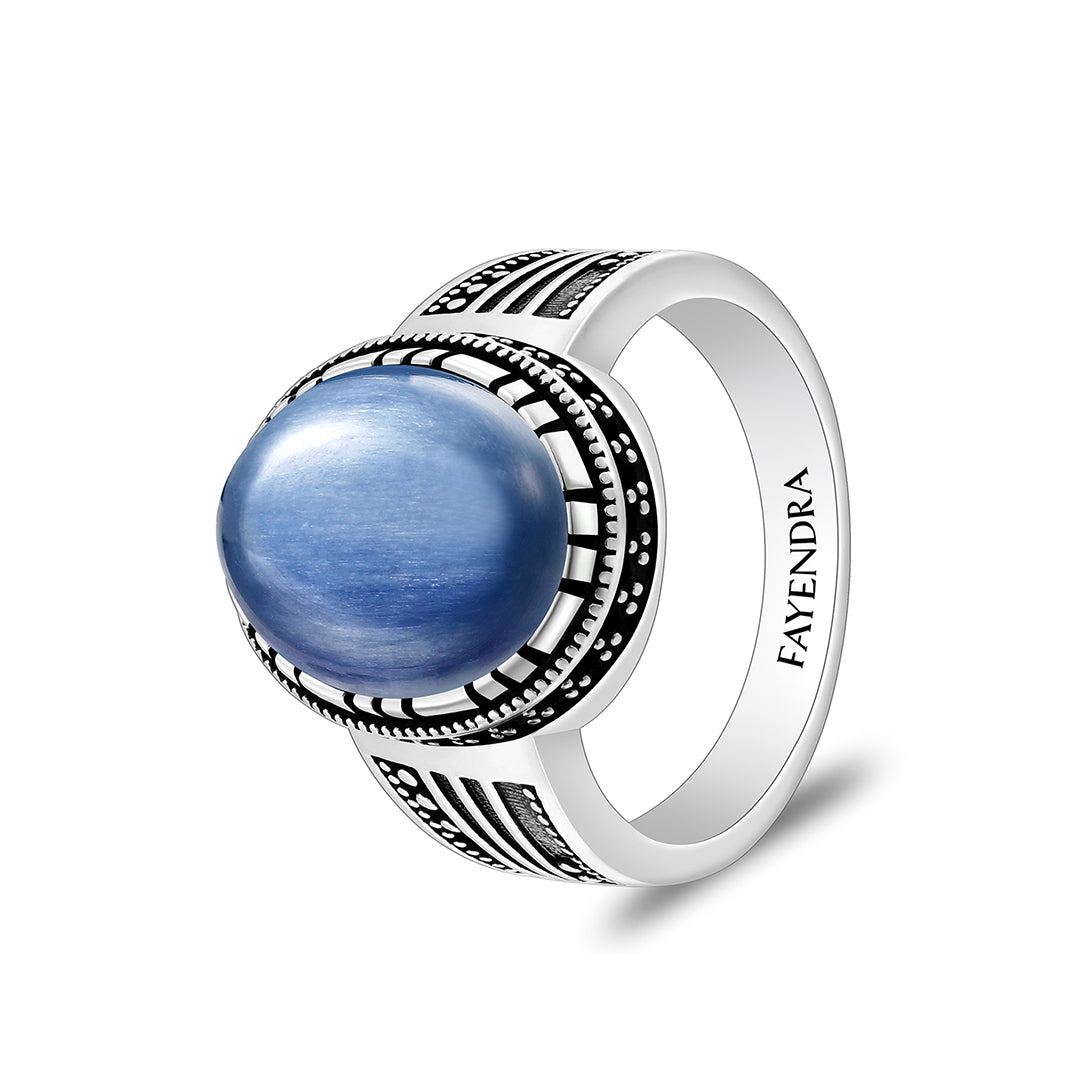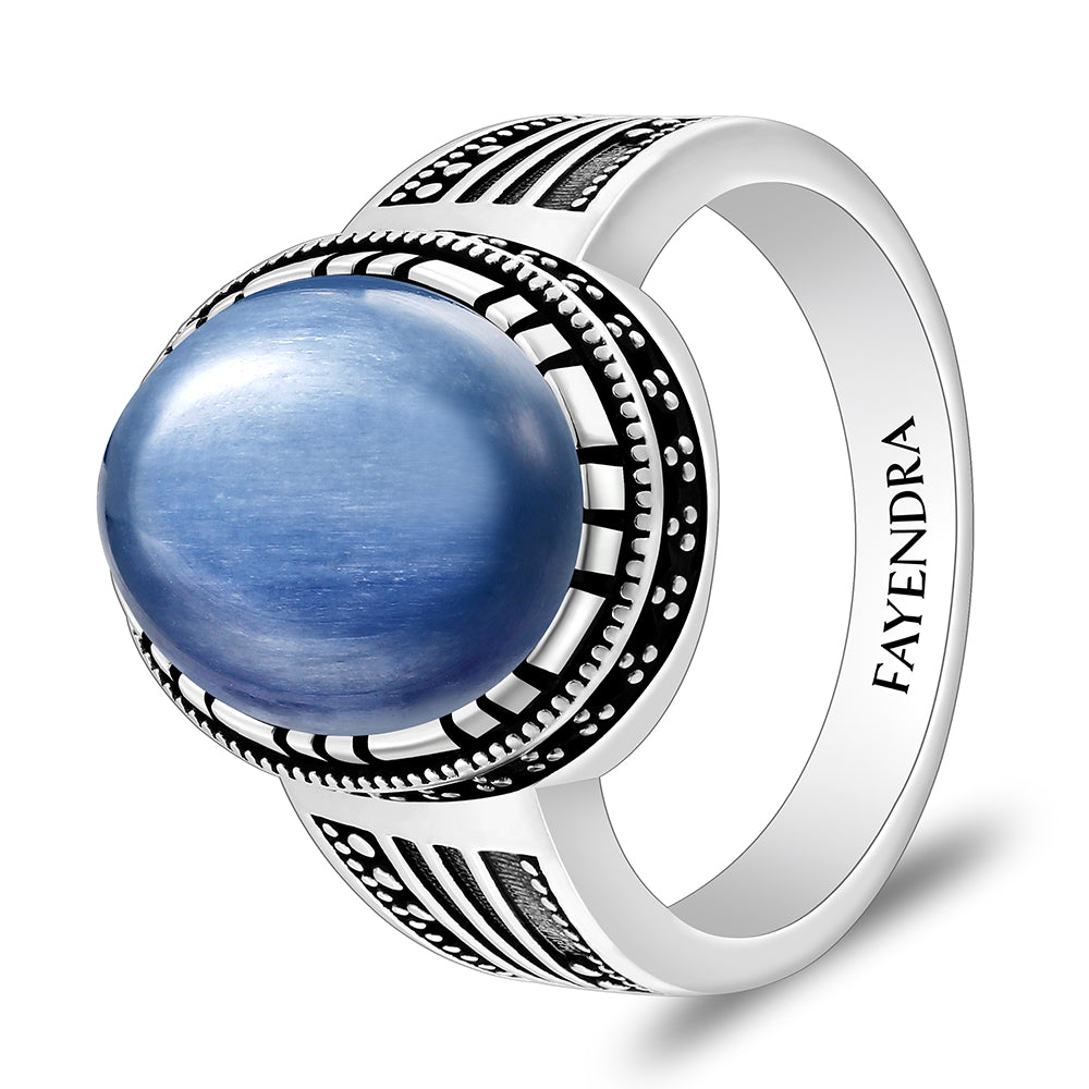 خاتم رجالي من الفضة الخالصة عيار 925 مطلي روديوم و اسود مرصع احجار كيانيت طبيعي كابشون