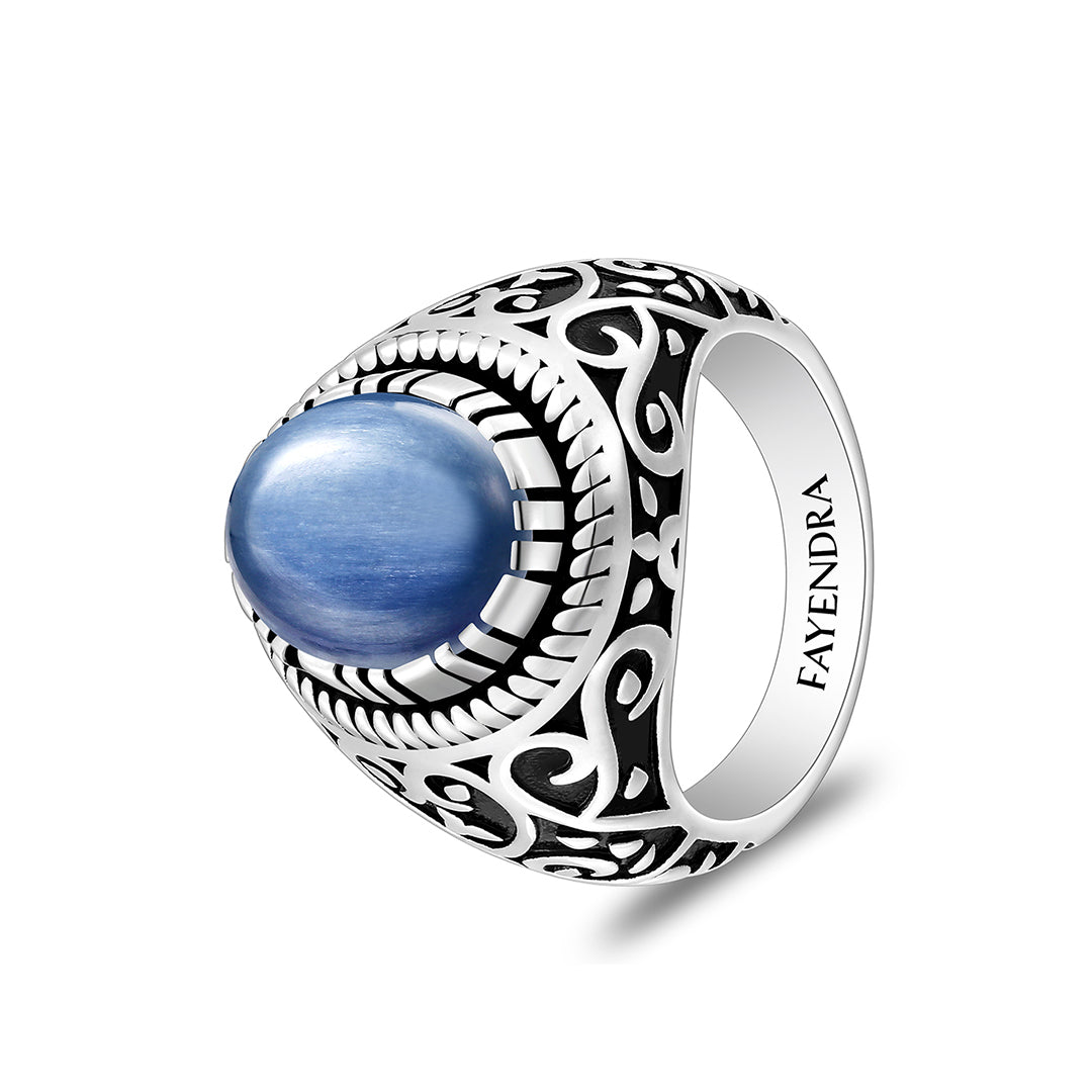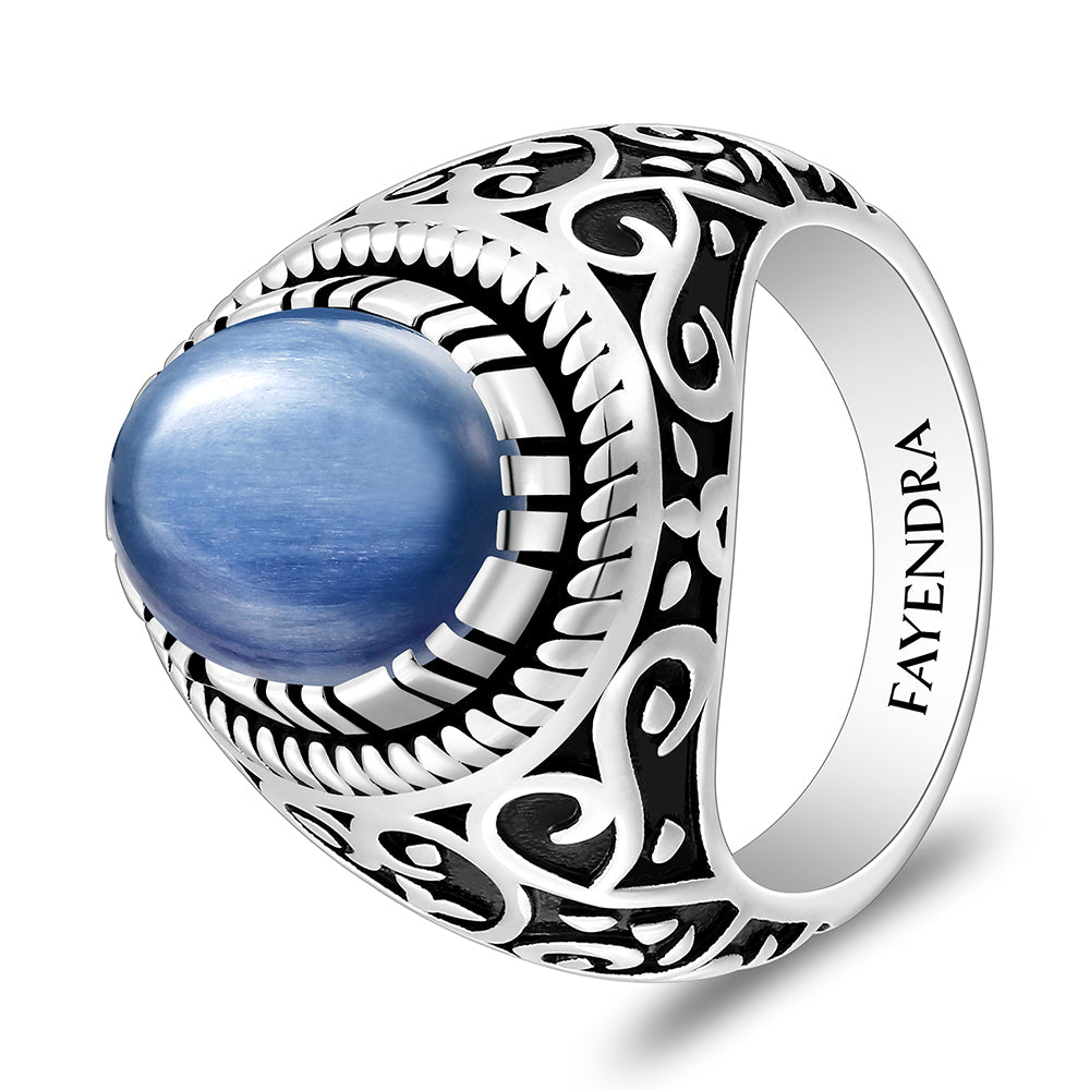 خاتم رجالي من الفضة الخالصة عيار 925 مطلي روديوم و اسود مرصع احجار كيانيت طبيعي كابشون