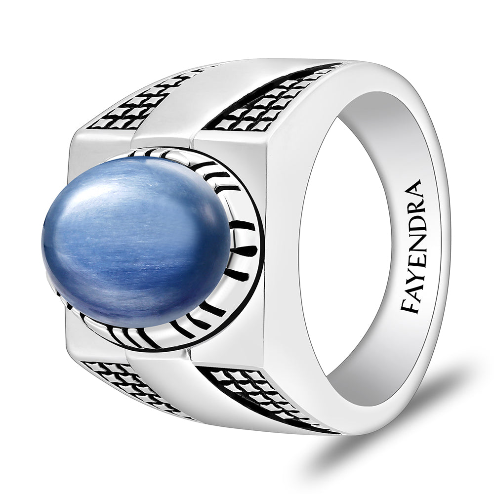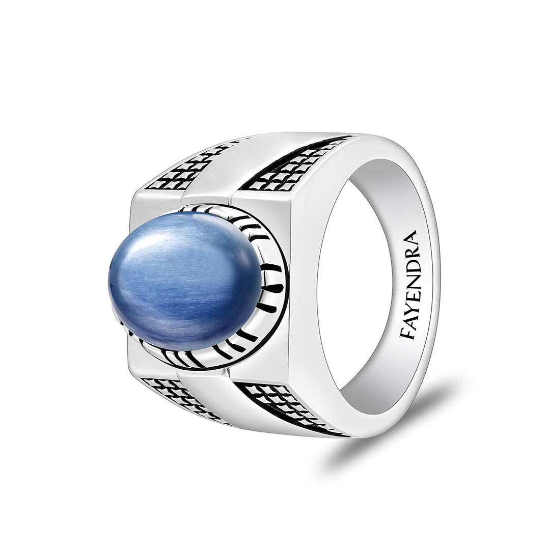 خاتم رجالي من الفضة الخالصة عيار 925 مطلي روديوم و اسود مرصع احجار كيانيت طبيعي كابشون