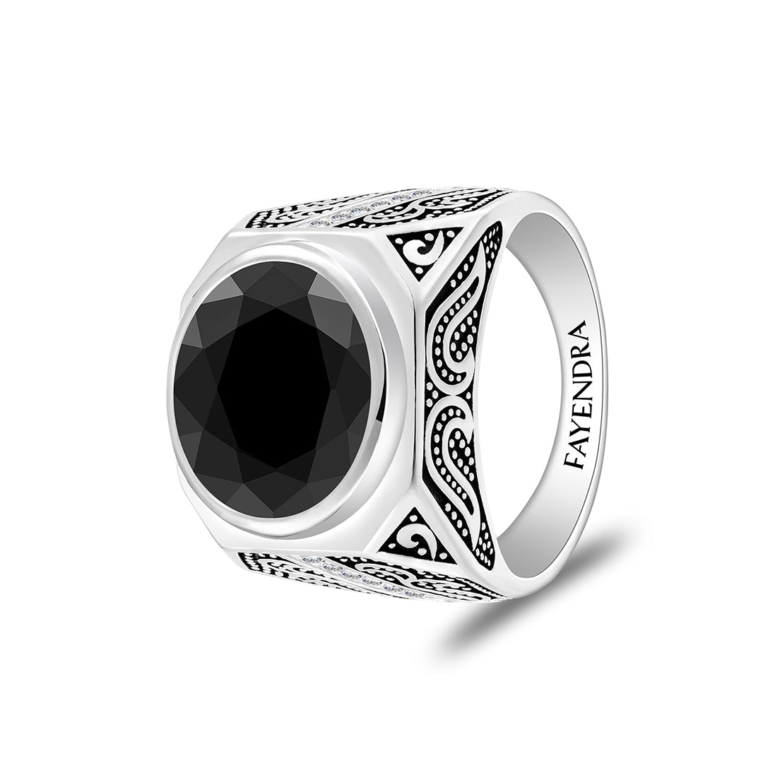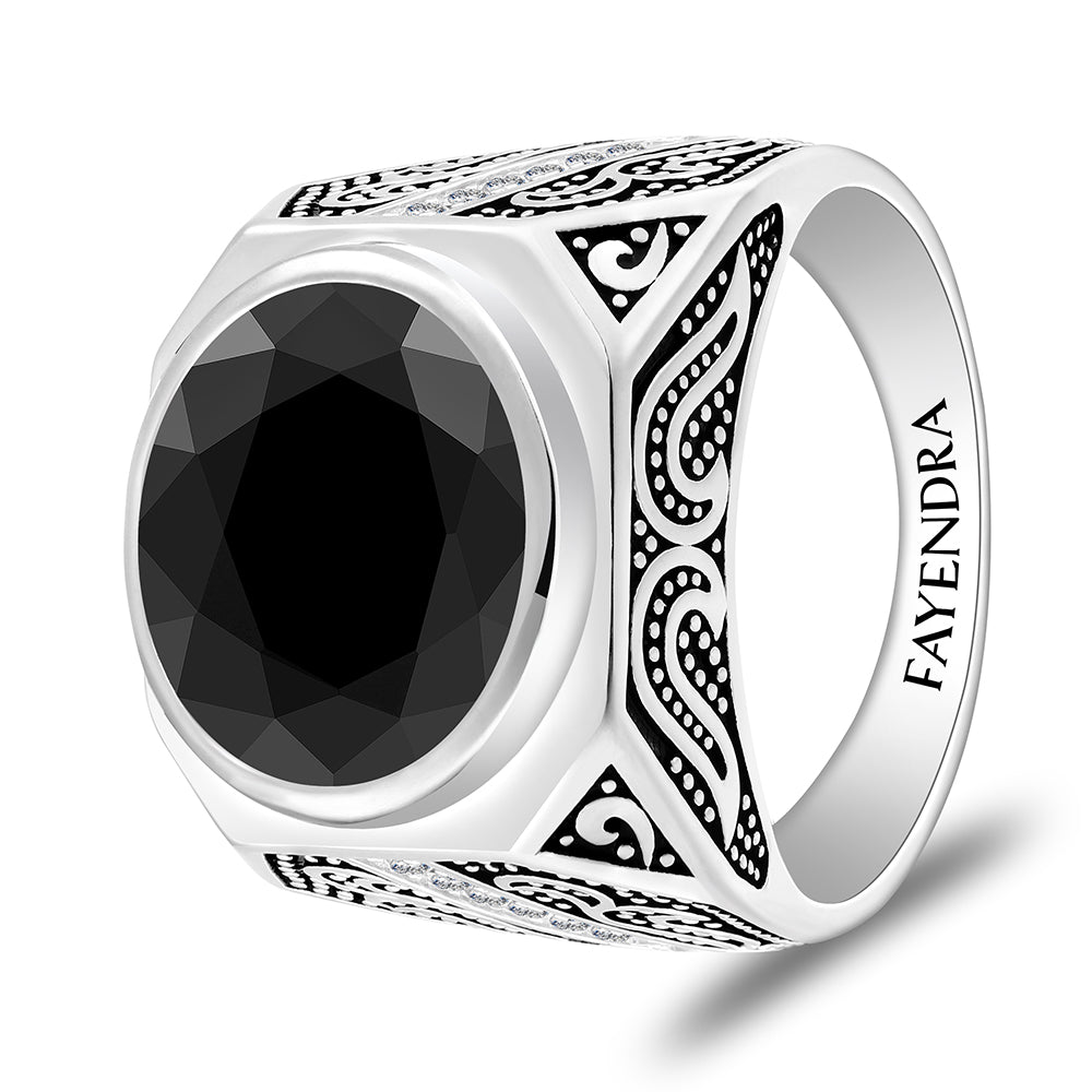خاتم رجالي من الفضة الخالصة عيار 925 مطلي روديوم و اسود مرصع احجار اونكس سبينل و فص ابيض