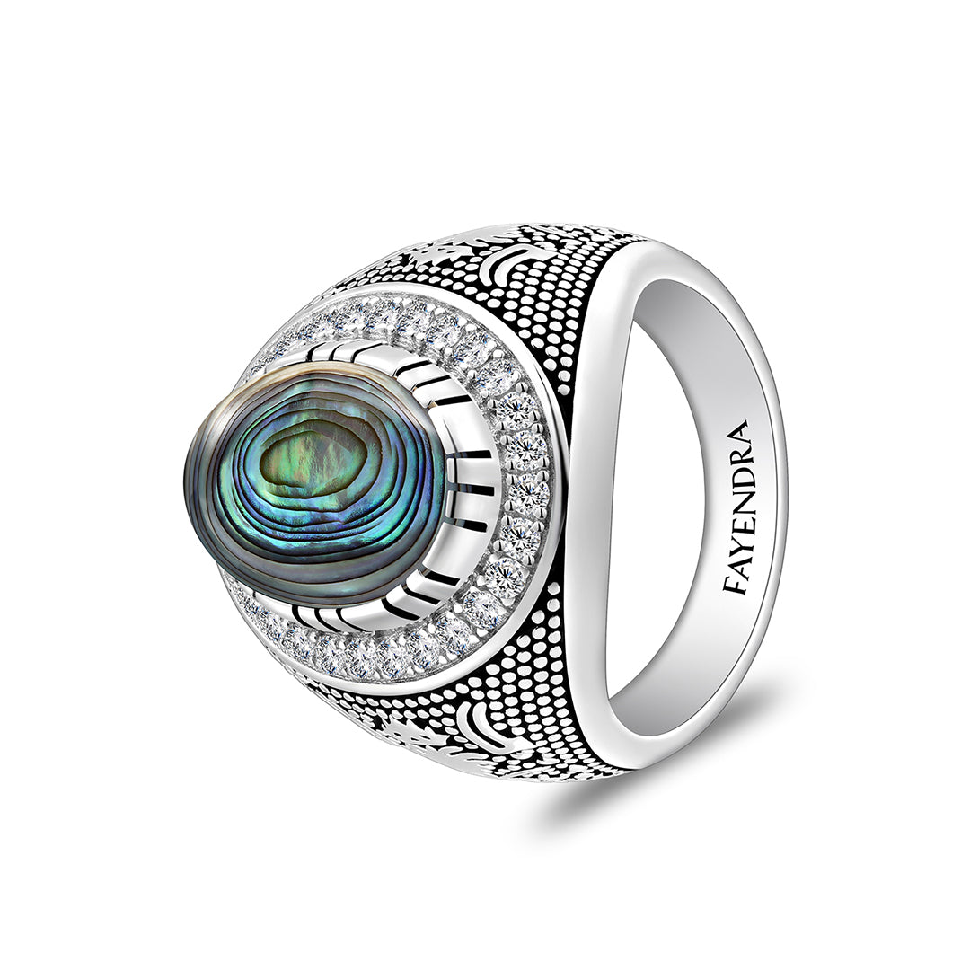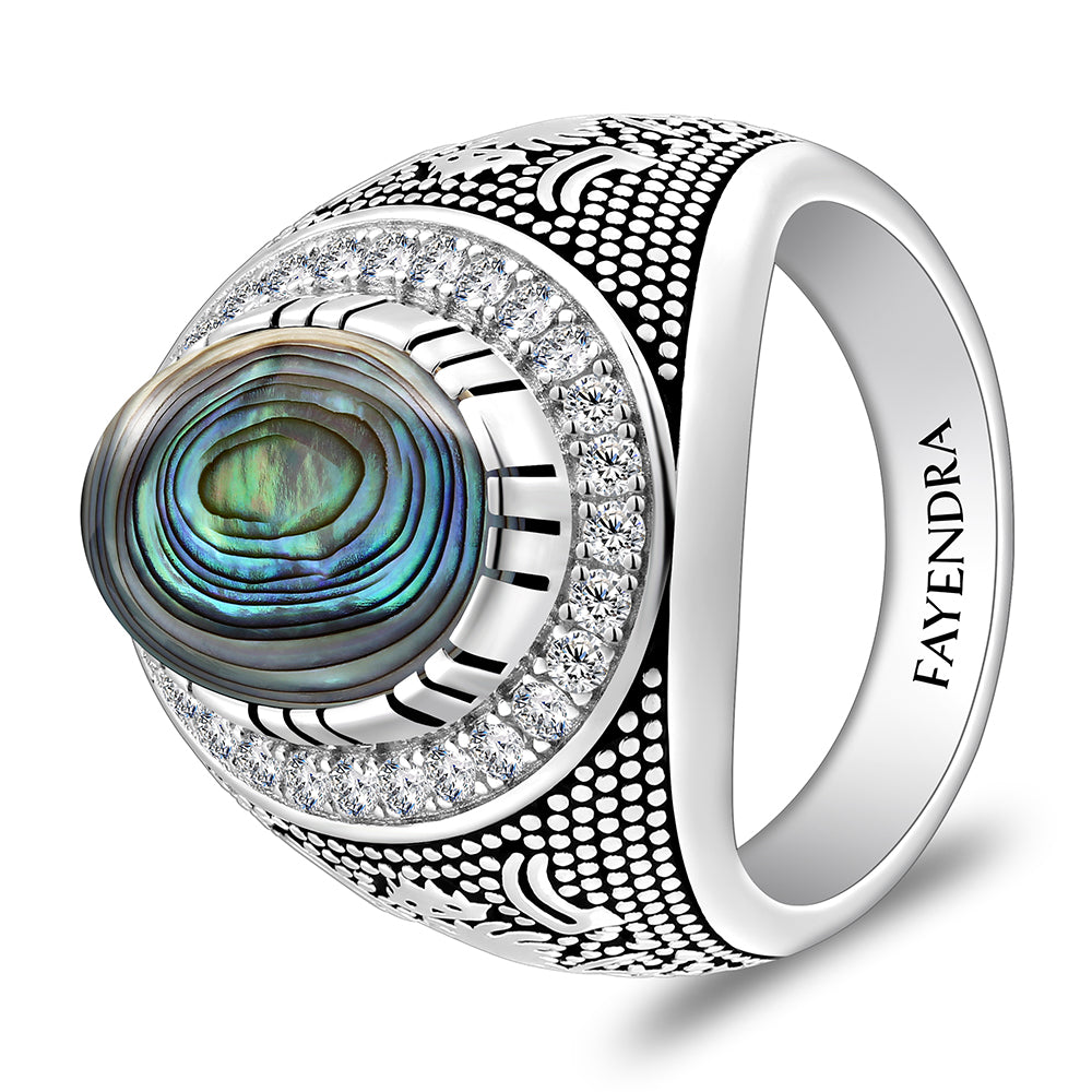 خاتم رجالي من الفضة الخالصة عيار 925 مطلي روديوم و اسود مرصع احجار صدف استرالي كابشون و فص ابيض