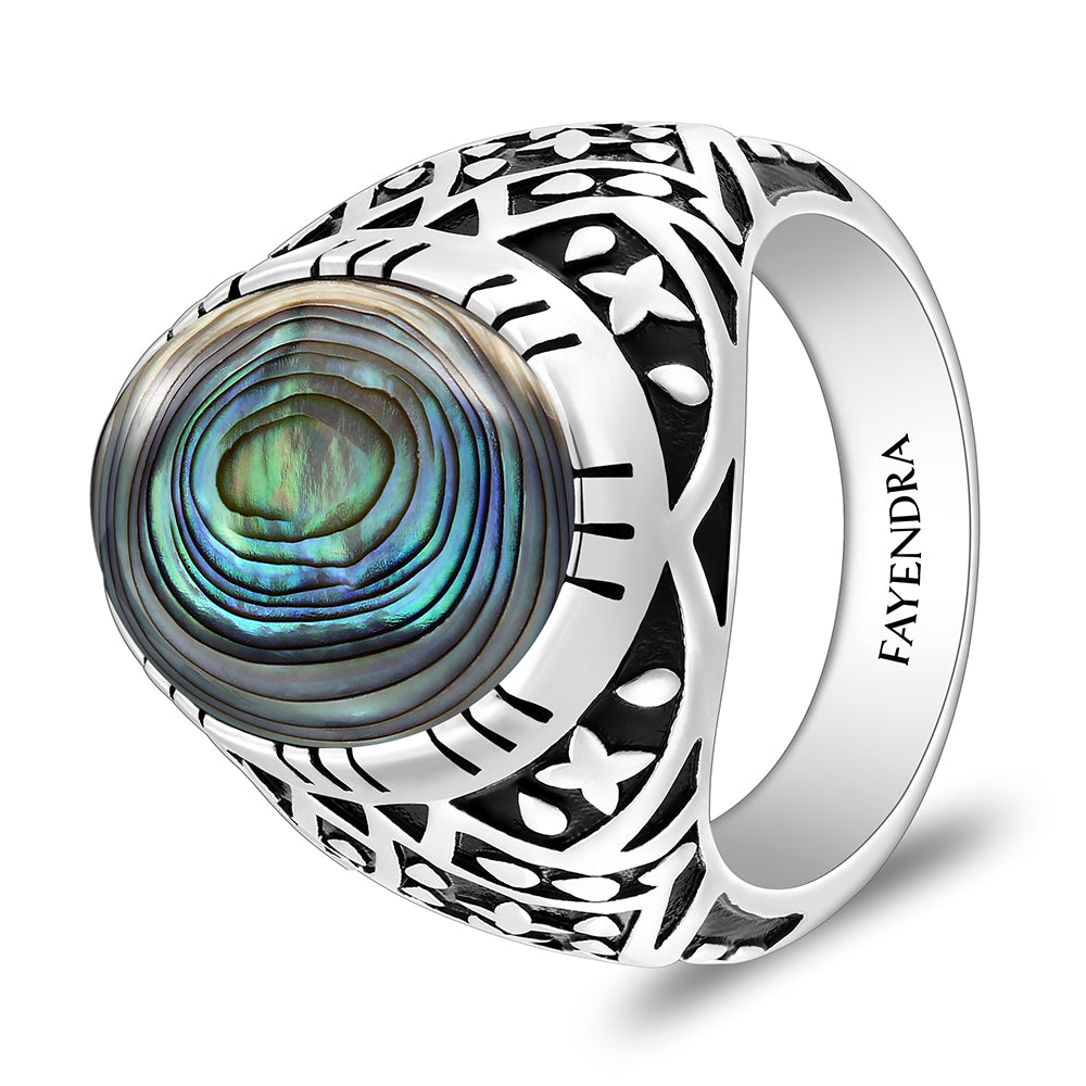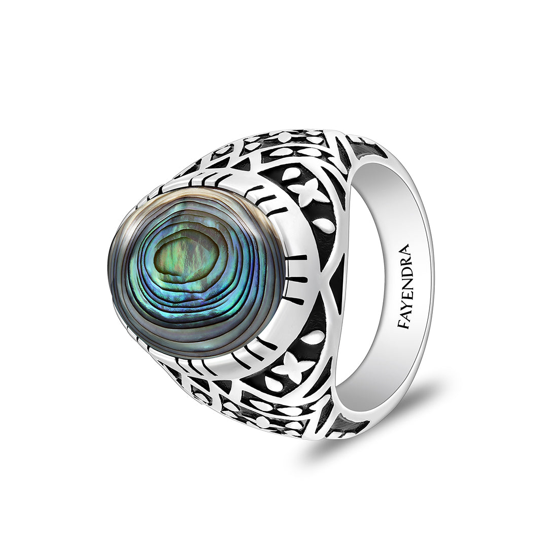 خاتم رجالي من الفضة الخالصة عيار 925 مطلي روديوم و اسود مرصع احجار صدف استرالي كابشون