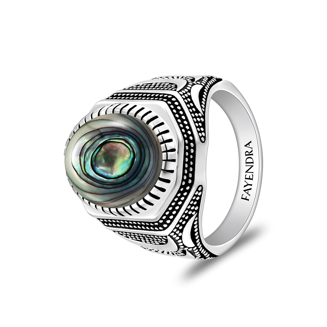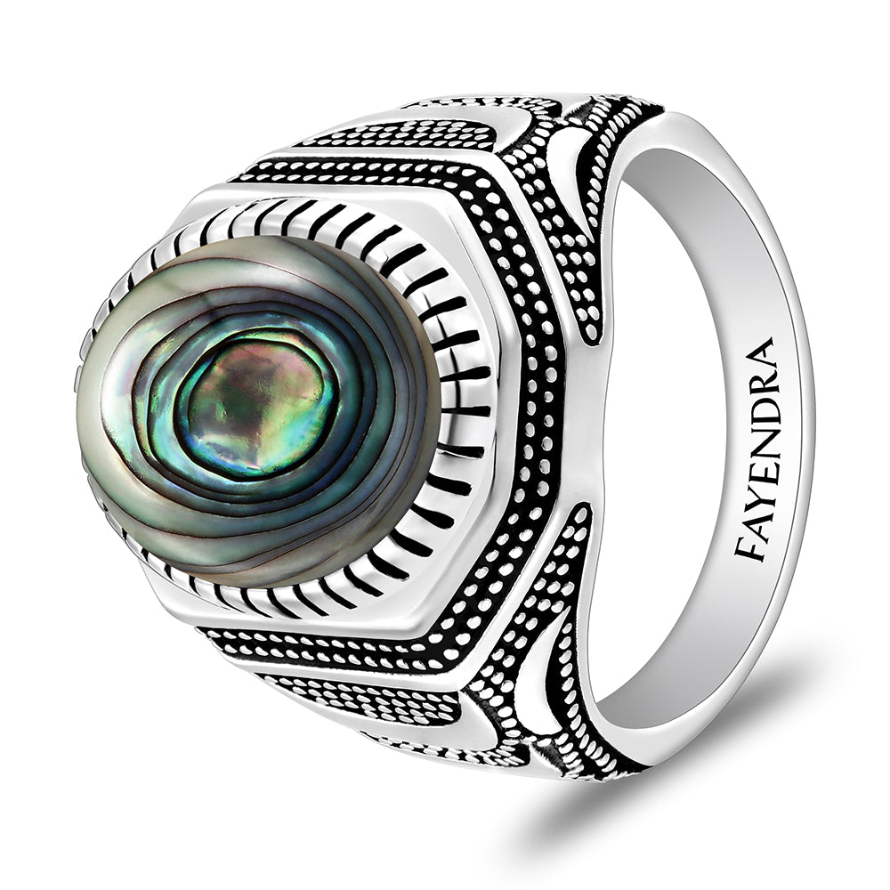 خاتم رجالي من الفضة الخالصة عيار 925 مطلي روديوم و اسود مرصع احجار صدف استرالي كابشون