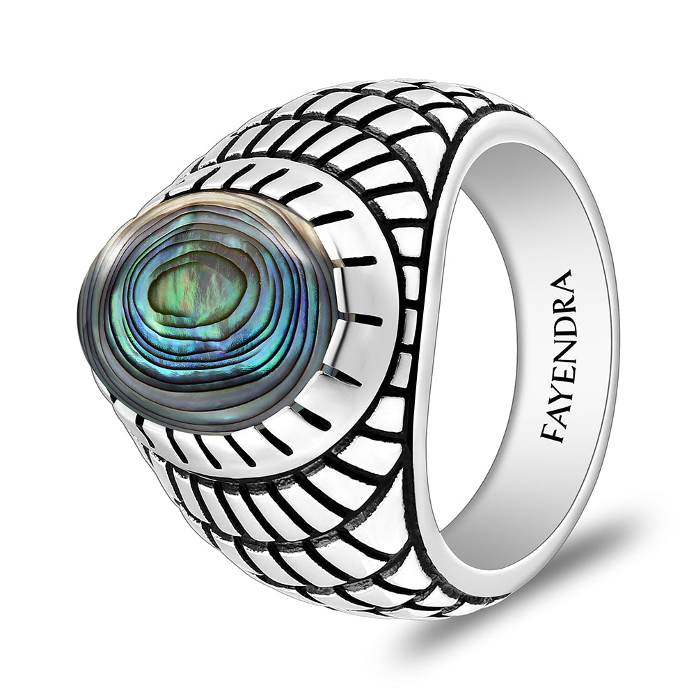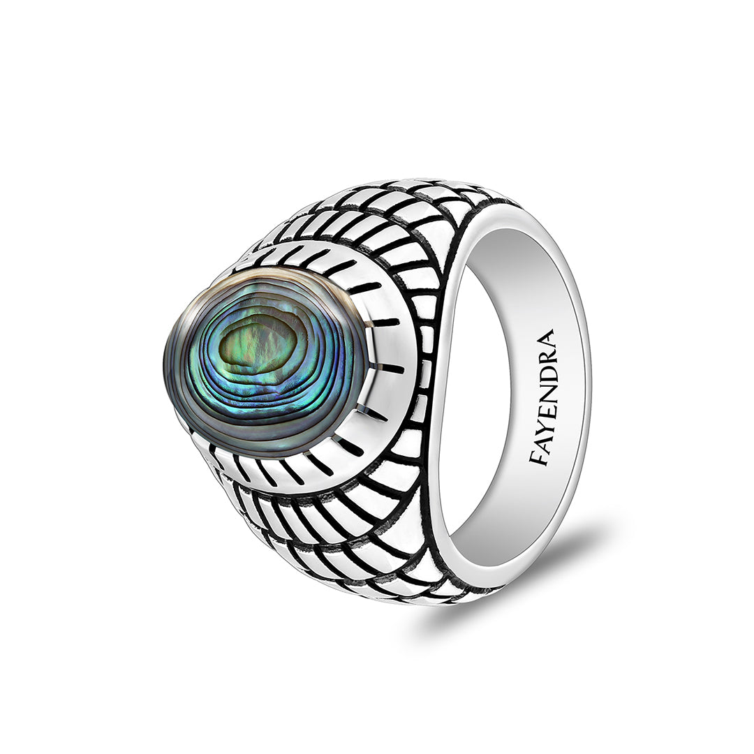 خاتم رجالي من الفضة الخالصة عيار 925 مطلي روديوم و اسود مرصع احجار صدف استرالي كابشون