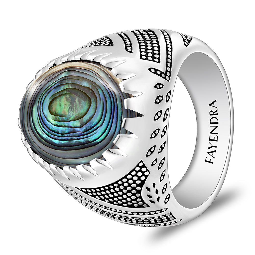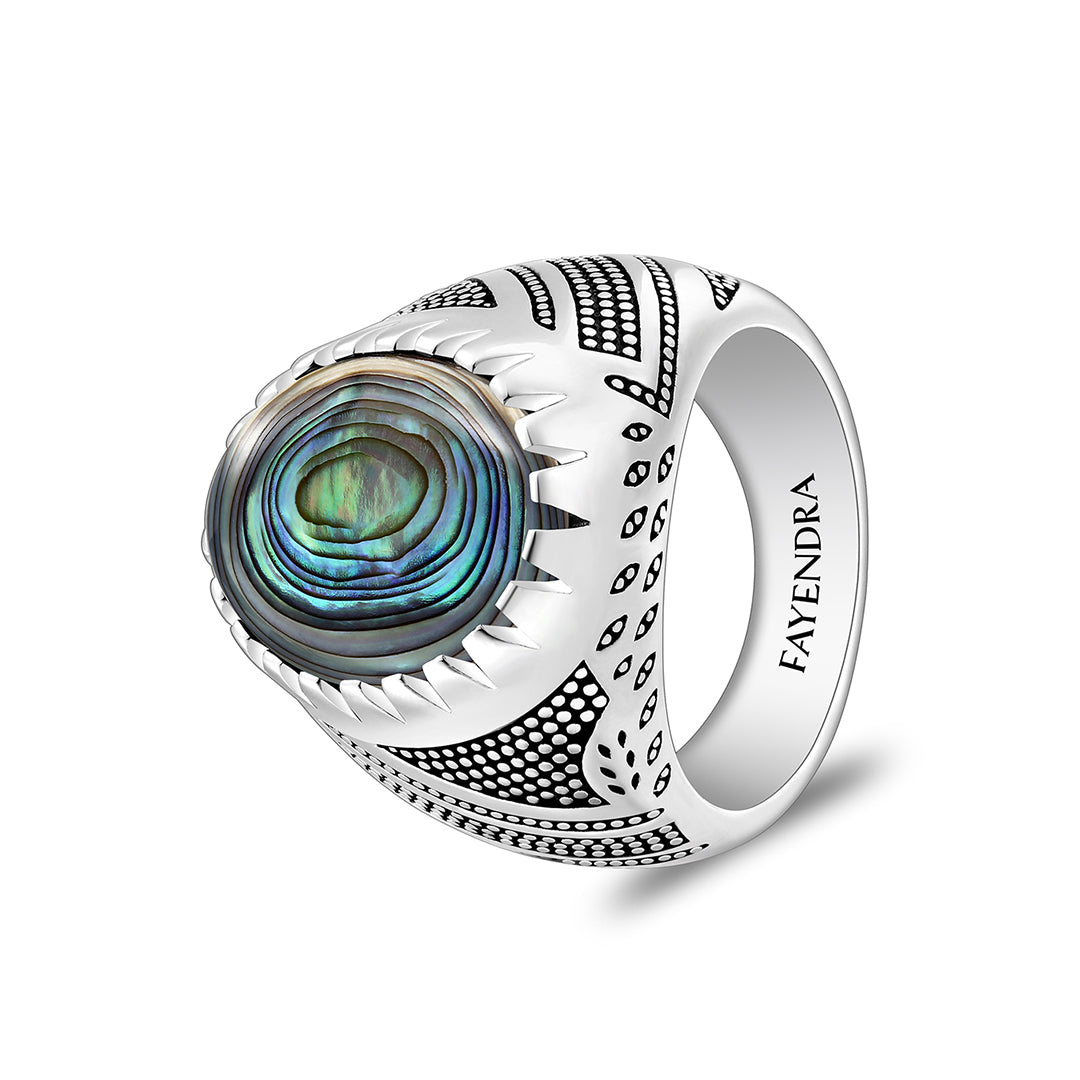 خاتم رجالي من الفضة الخالصة عيار 925 مطلي روديوم و اسود مرصع احجار صدف استرالي كابشون
