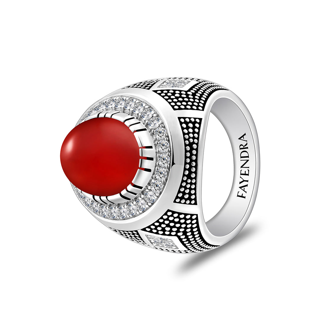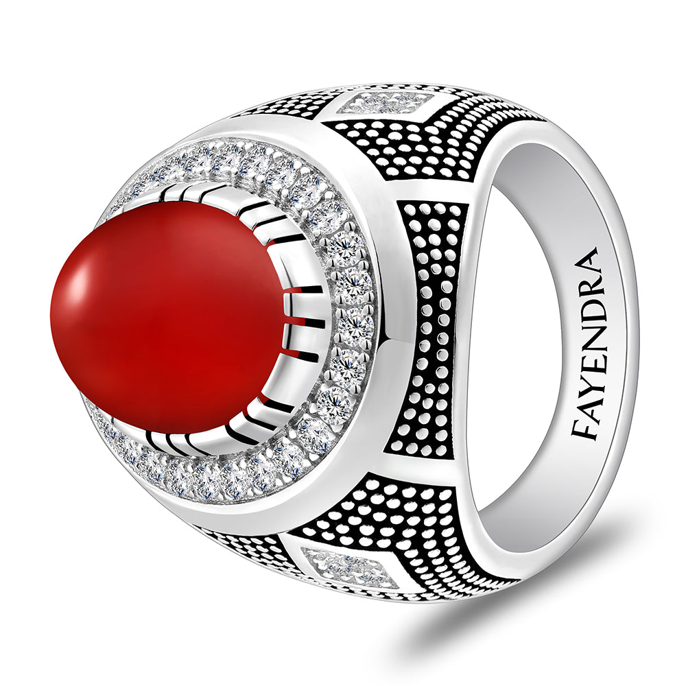 خاتم رجالي من الفضة الخالصة عيار 925 مطلي روديوم و اسود مرصع احجارعقيق احمر كابشون و فص ابيض