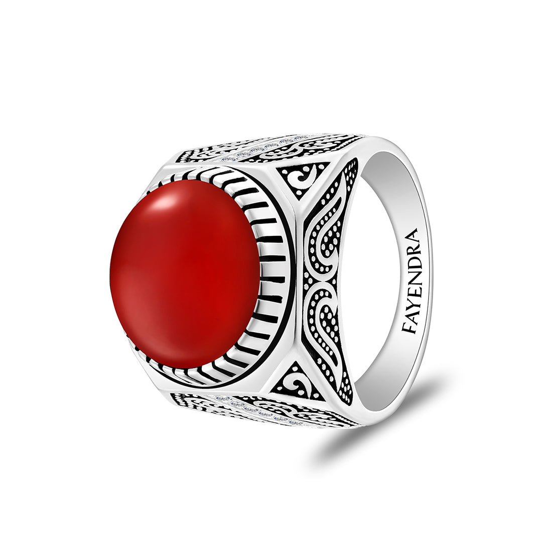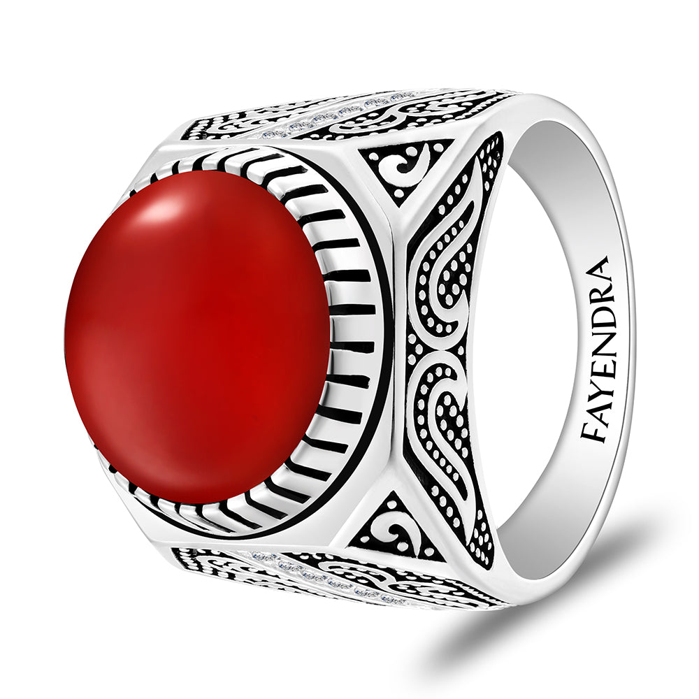 خاتم رجالي من الفضة الخالصة عيار 925 مطلي روديوم و اسود مرصع احجار عقيق احمر كابشون و فص ابيض