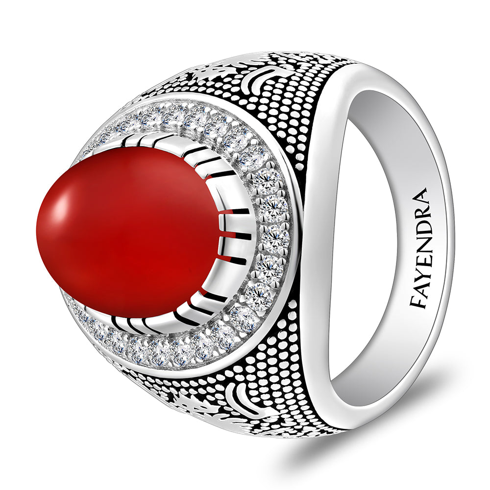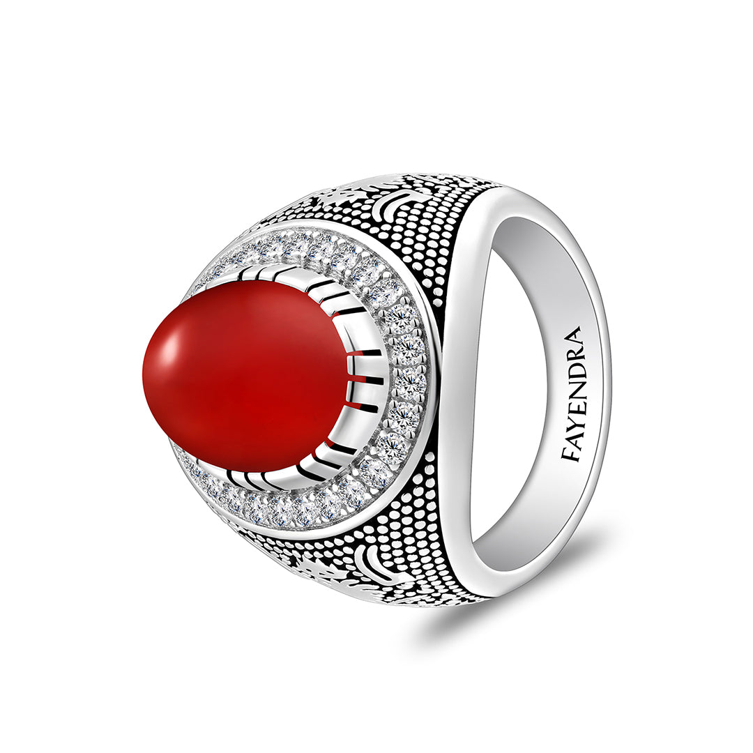 خاتم رجالي من الفضة الخالصة عيار 925 مطلي روديوم و اسود مرصع احجار عقيق احمر كابشون و فص ابيض